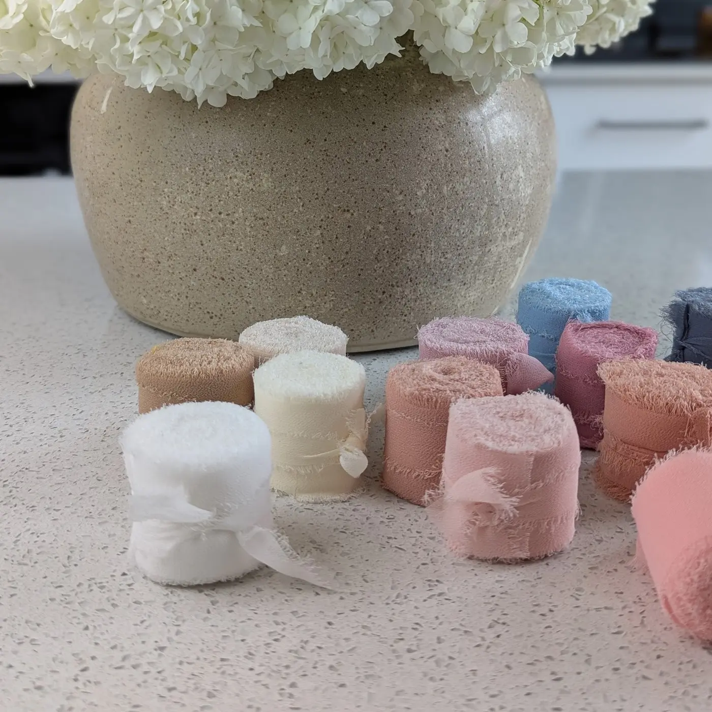 Les rubans en tissu et en jute s’accordent parfaitement aux styles bohème, rustique et éco. La dentelle ajoute de la légèreté et du romantisme, surtout pour les compositions de mariage et vintage.