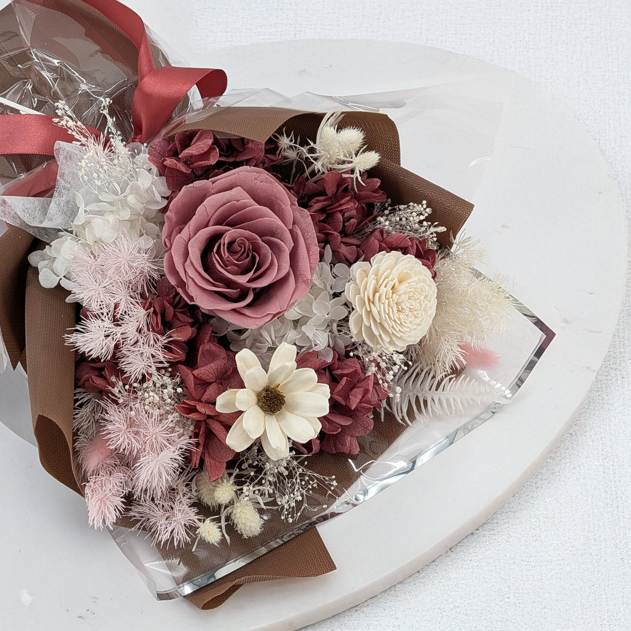 Contrairement aux fleurs fraîches qui évoluent chaque jour, les bouquets stabilisés conservent leur apparence dès l’achat. C’est particulièrement important dans les projets d’aménagement intérieur et de décoration, où chaque détail compte.