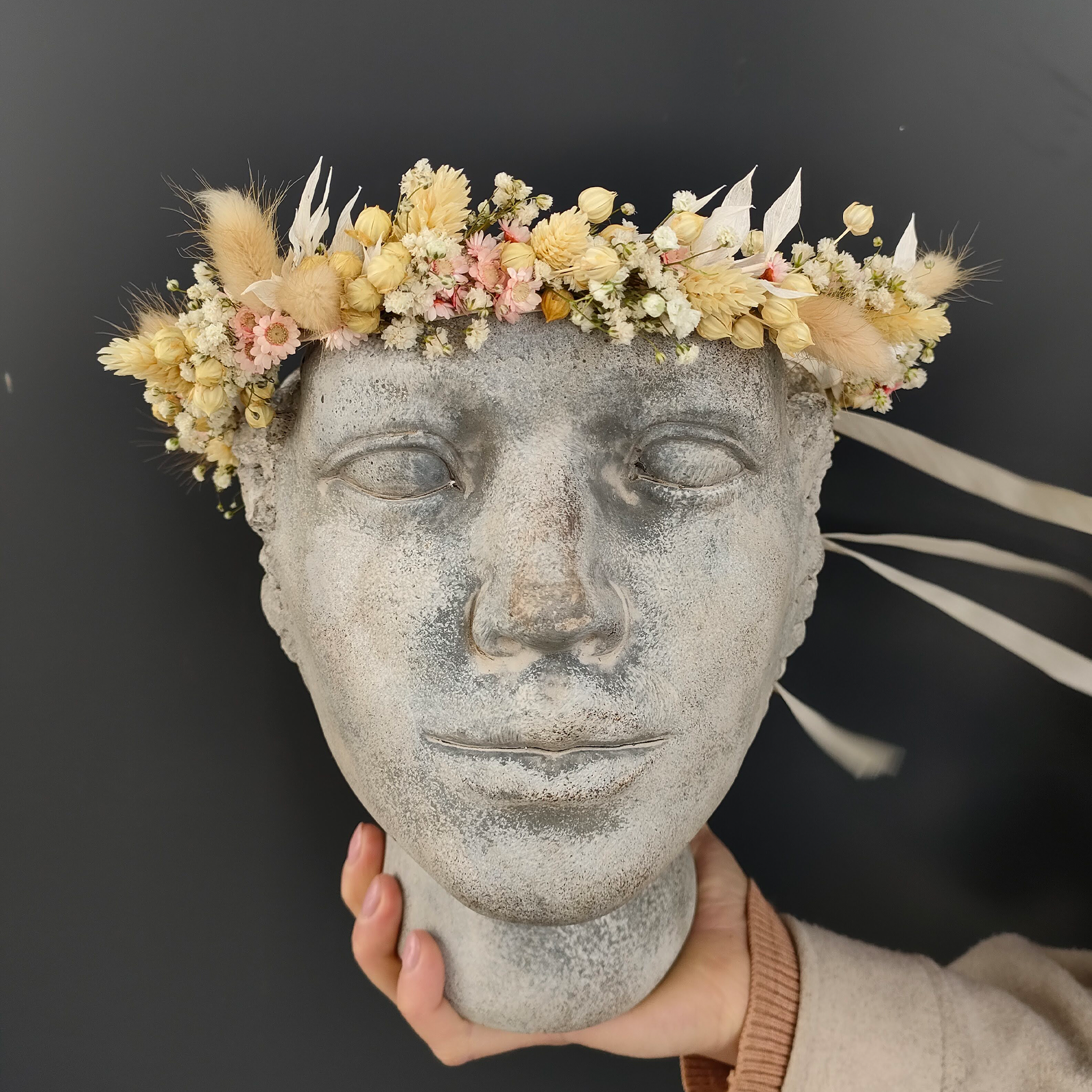 Les couronnes de fleurs en fleurs séchées sont un accessoire unique pour de nombreuses occasions. Elles sont populaires pour les séances photo, les mariages, enterrements de vie de jeune fille, communions, festivals, événements en plein air et séances familiales. Elles constituent également un magnifique élément de style pour les enfants et les adultes.