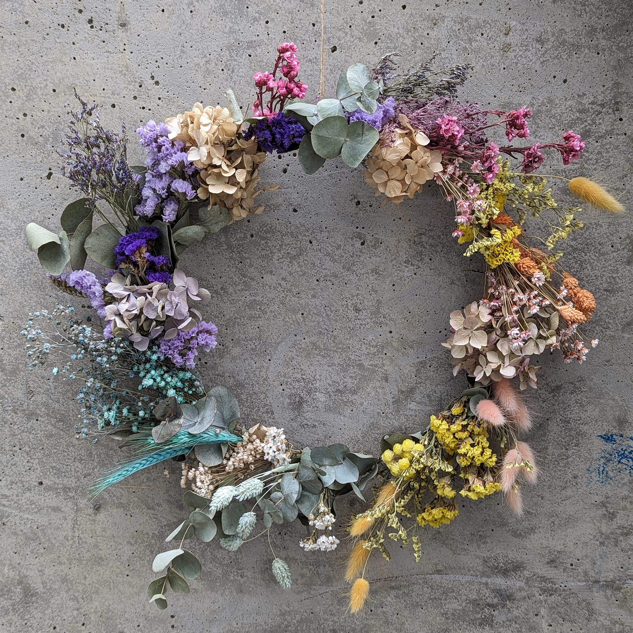 Couronnes en fleurs séchées et stabilisées – décoration pour portes, coiffures et intérieurs toute l’année