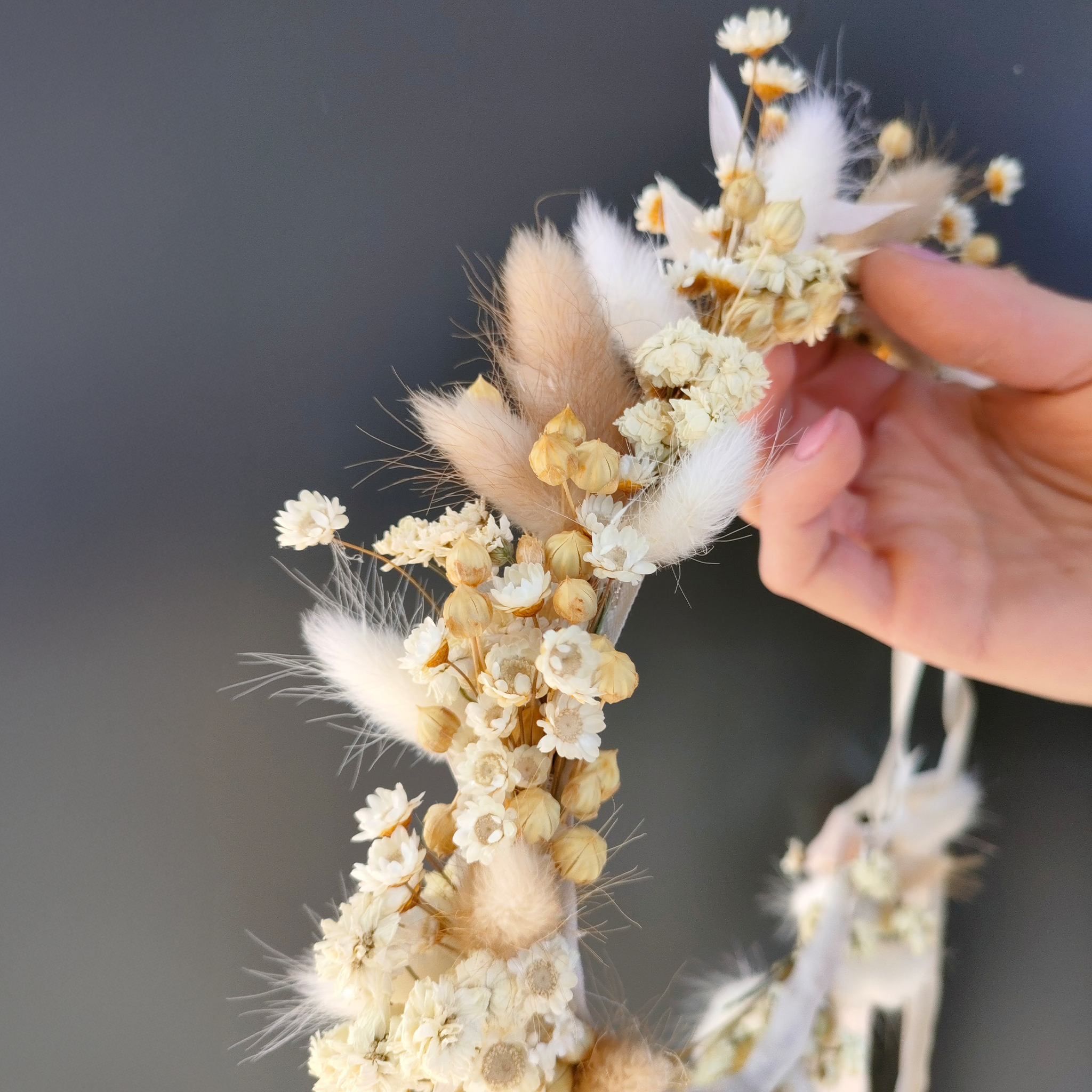 Les couronnes en fleurs séchées et stabilisées sont des décorations intemporelles offrant presque des possibilités infinies d’aménagement. Elles peuvent décorer portes, murs, tables, fenêtres, séances photo et tenues. Elles sont durables, élégantes et pleines de charme naturel.