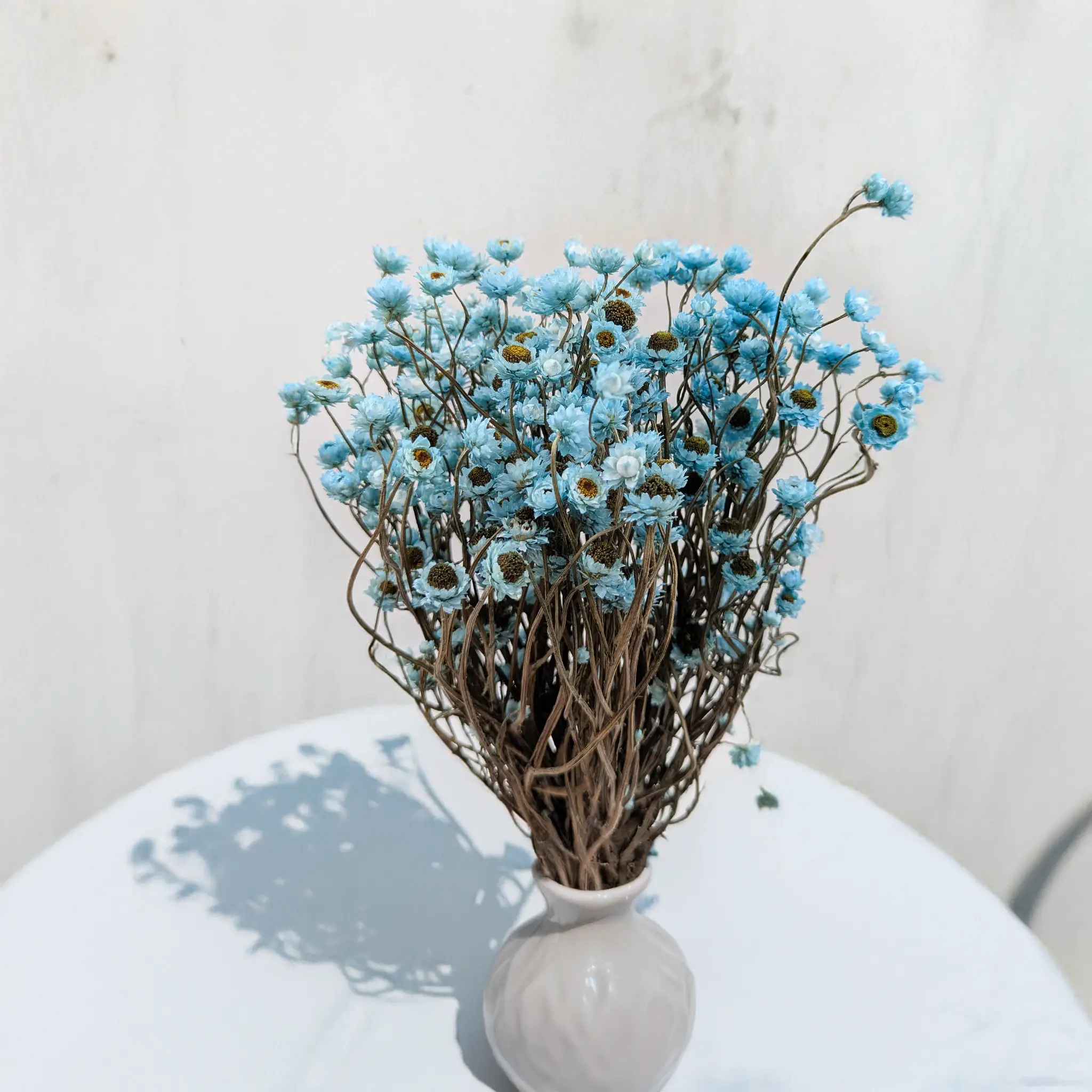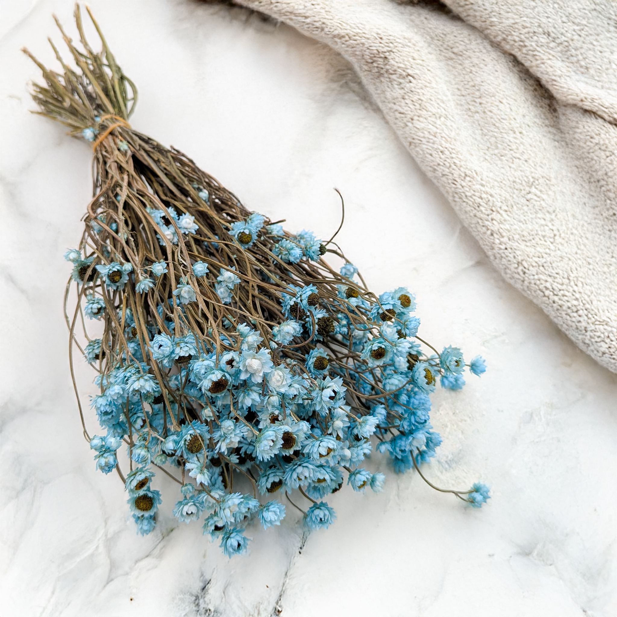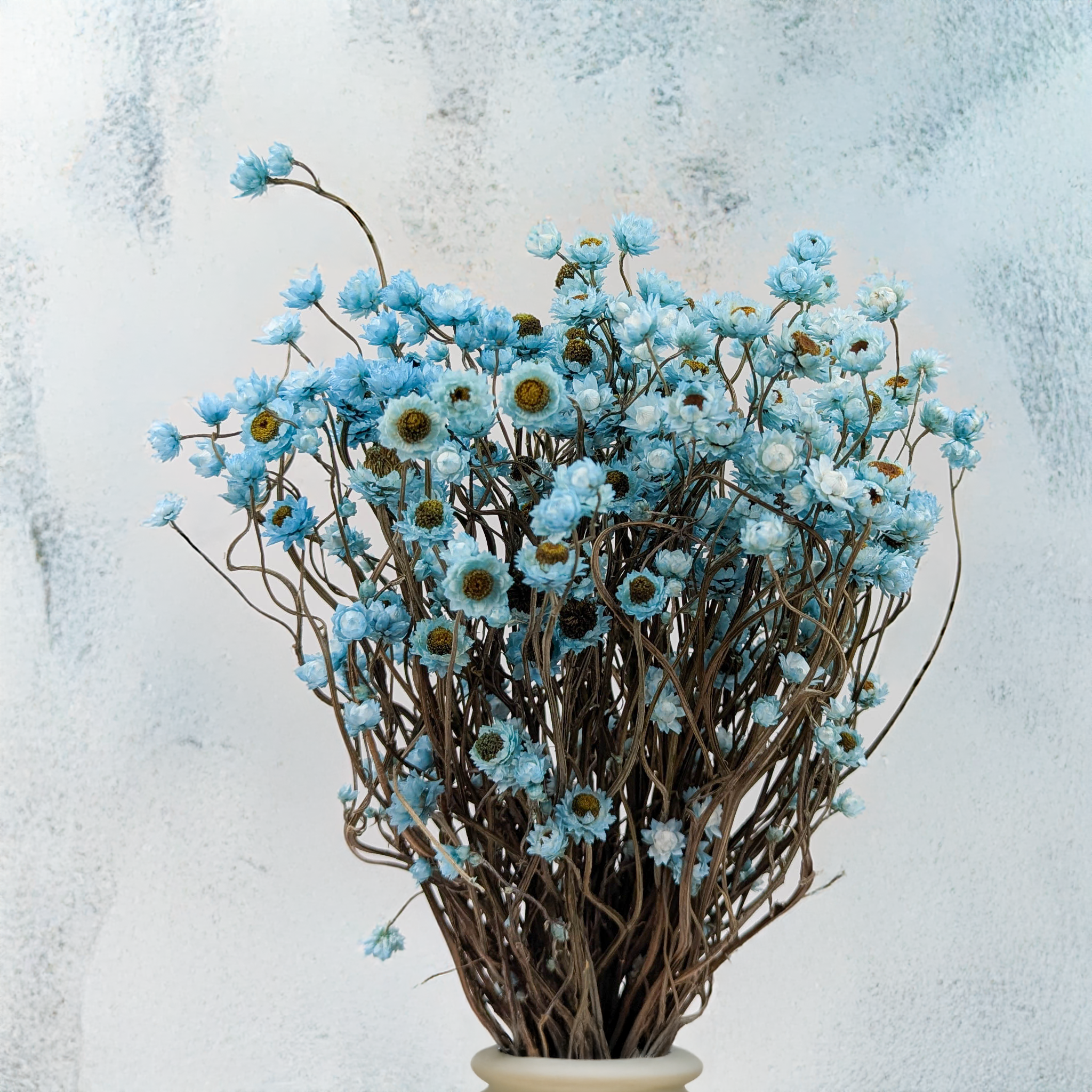 La fleur éternelle azur est une version PREMIUM de l’Ammobium alatum décoratif. Sa teinte vive évoque le ciel d’été et la mer calme. Séchée et teintée avec soin, elle conserve sa forme et sa texture délicate, apportant légèreté et originalité à chaque composition florale.