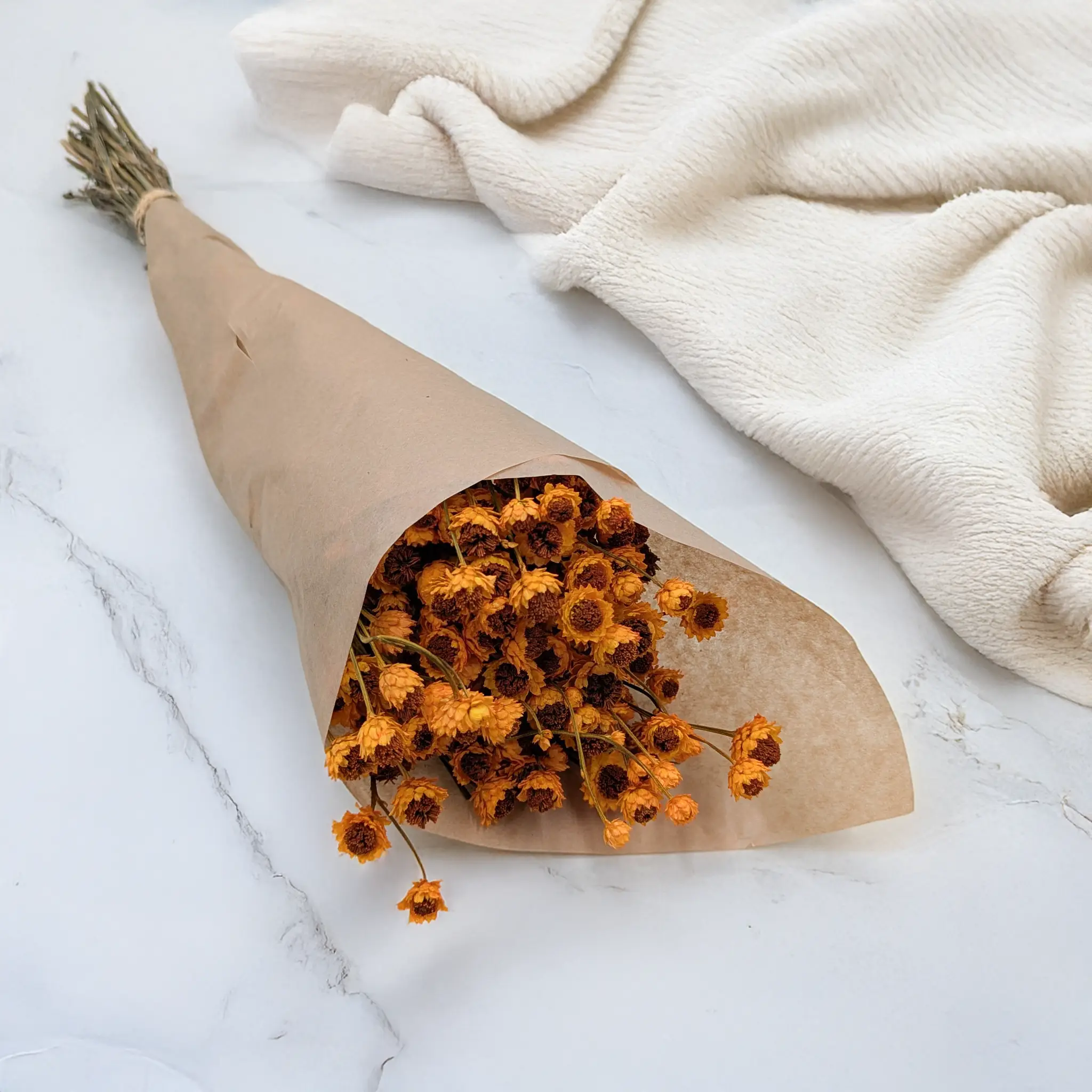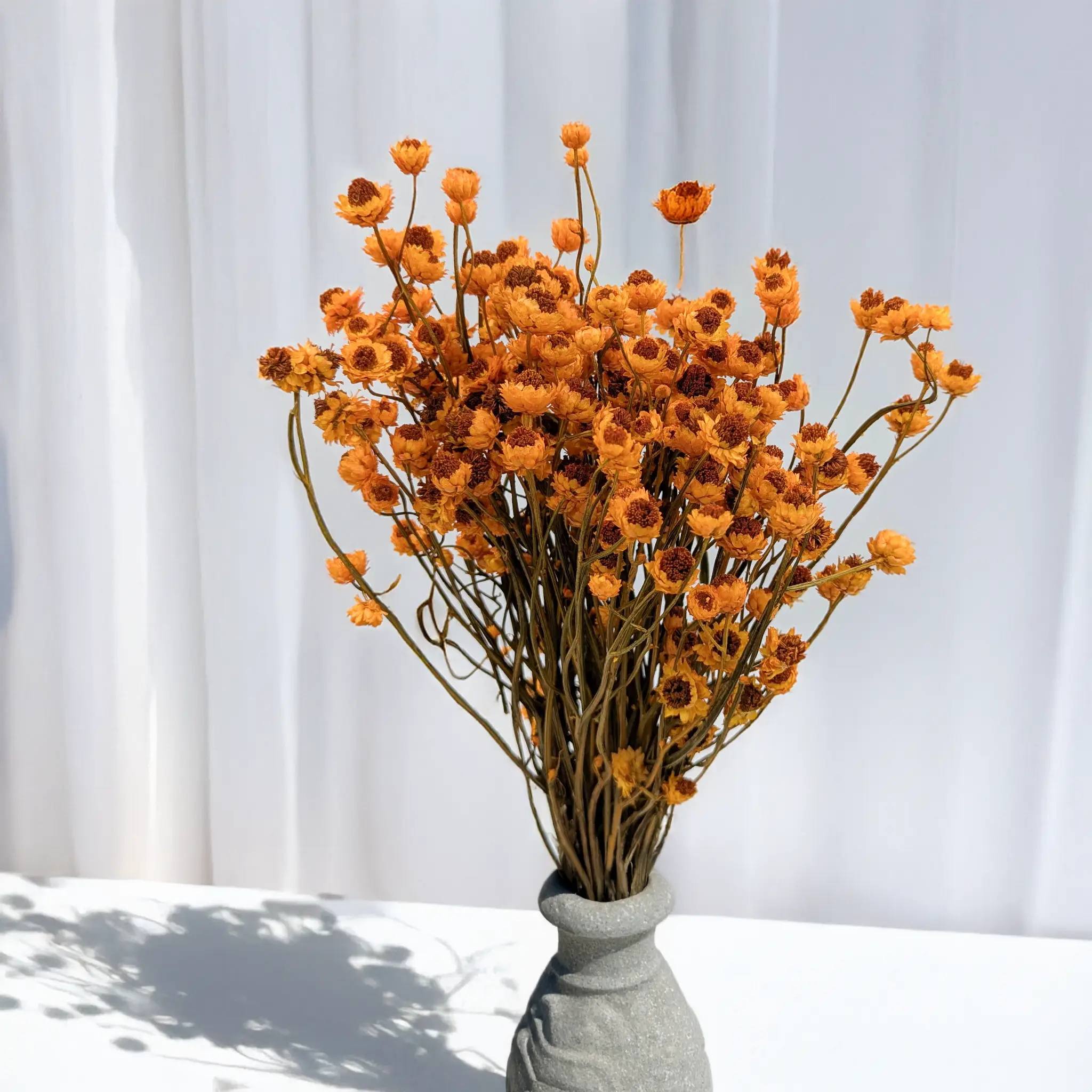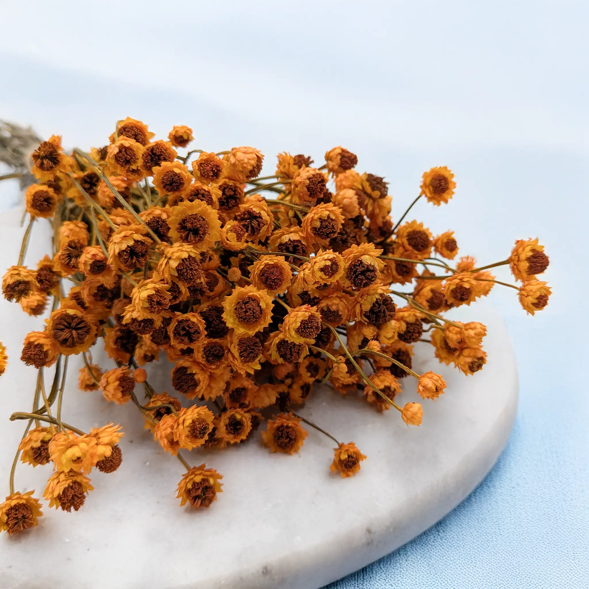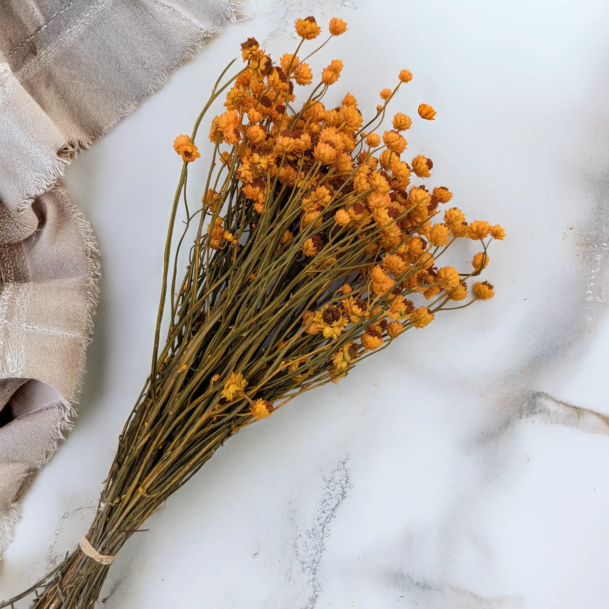 <p><strong>Ammobium séché de couleur orange</strong>, également appelé <em>fleur éternelle</em>, est une plante décorative aux fleurs papierisées dans une teinte chaude et lumineuse. Sa couleur apporte dynamisme et chaleur aux compositions florales, aussi bien saisonnières que permanentes. Grâce au processus de séchage, elle conserve son aspect pendant de nombreux mois.</p>