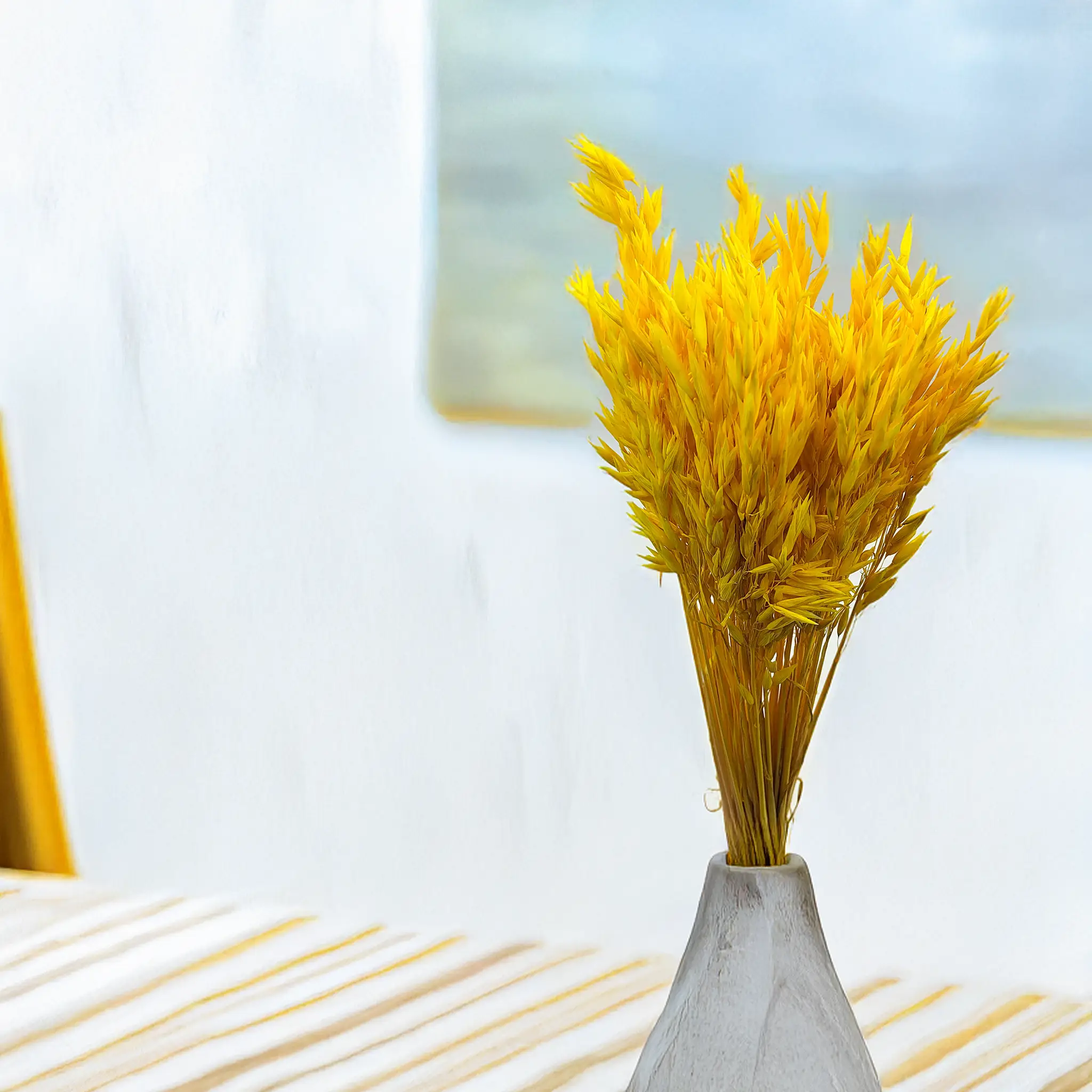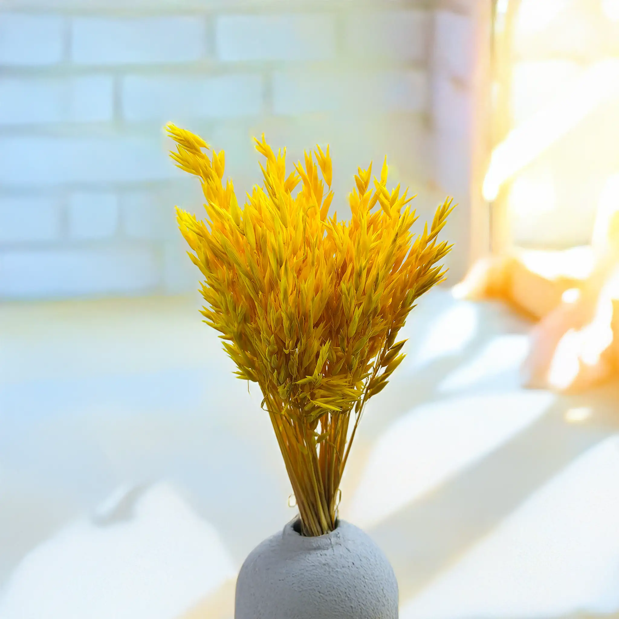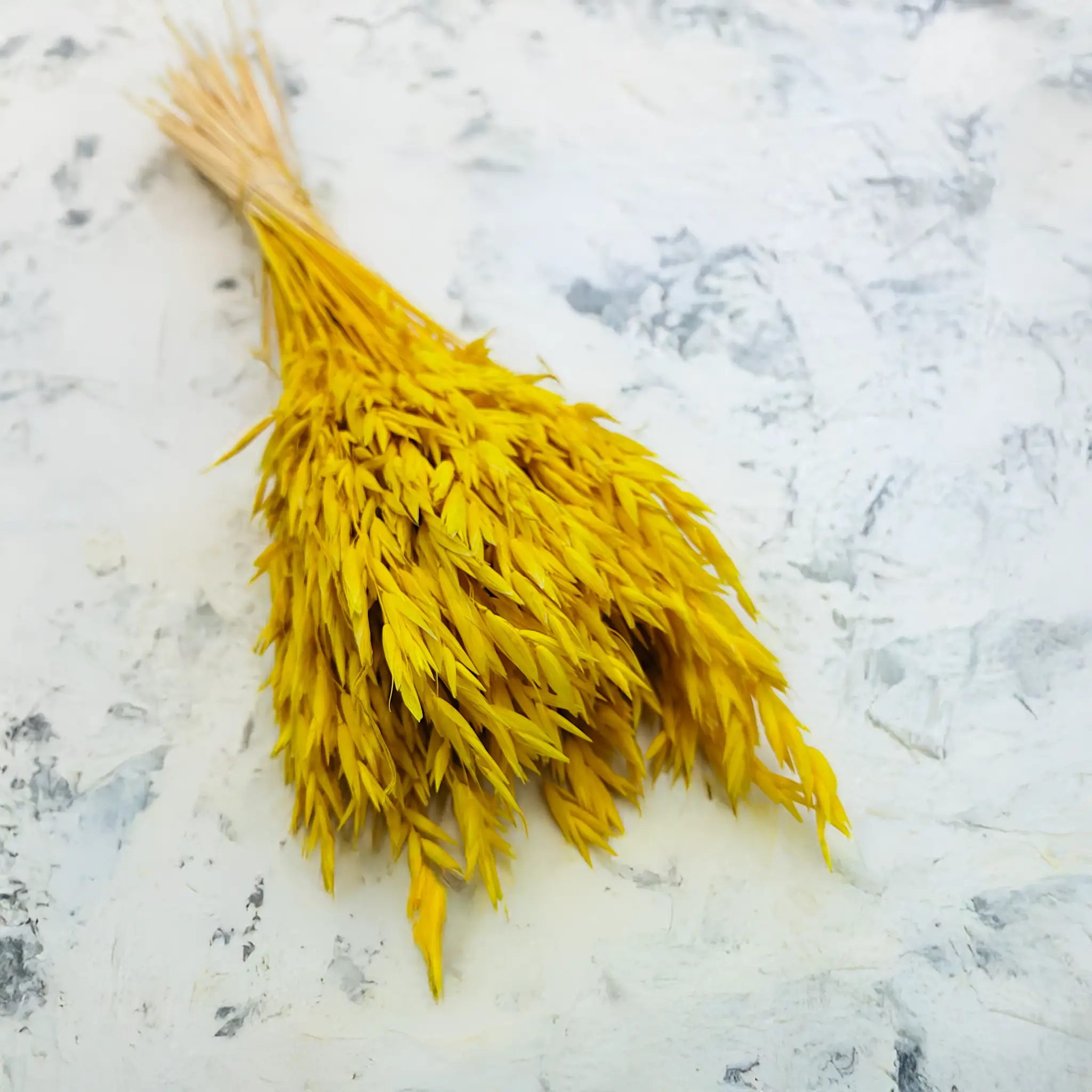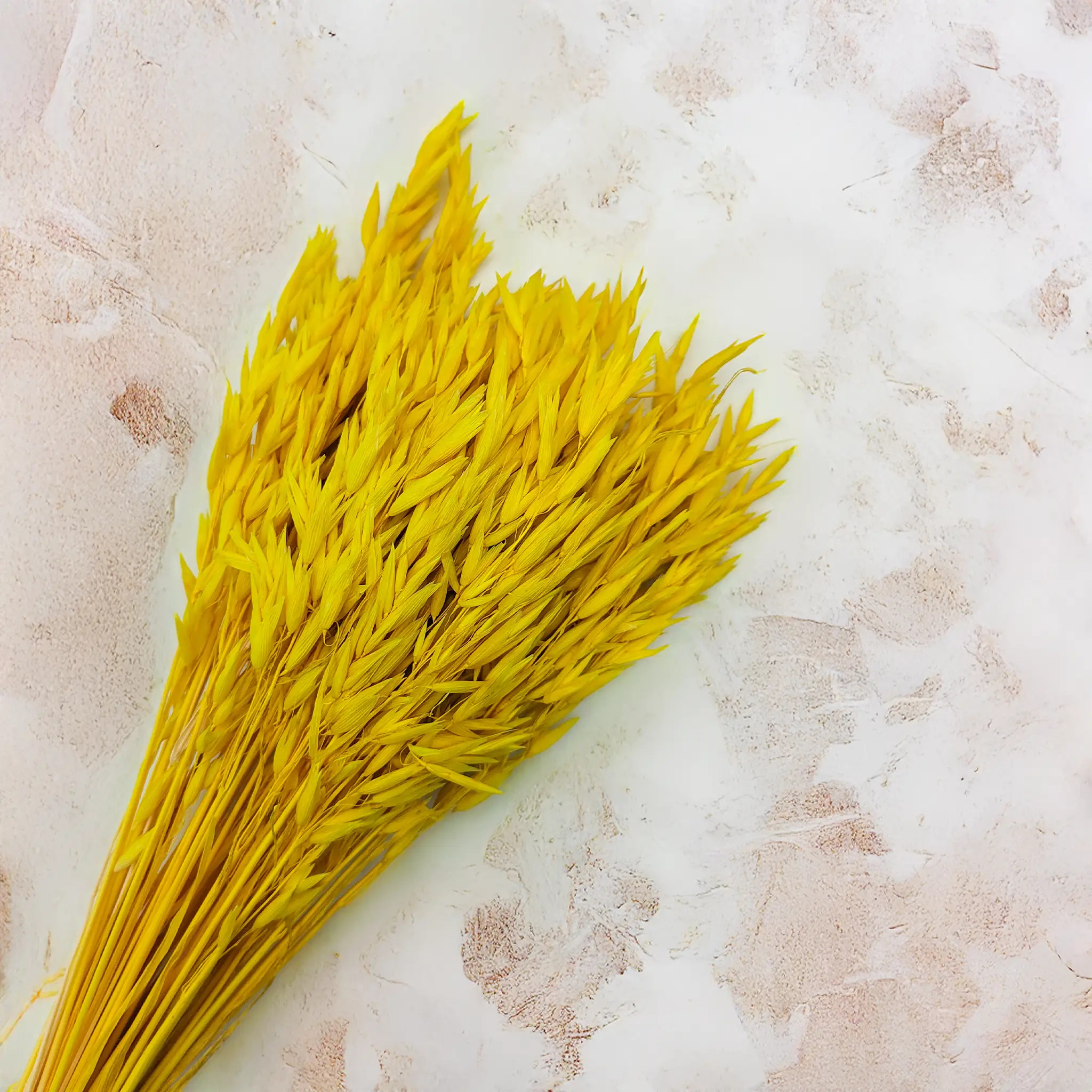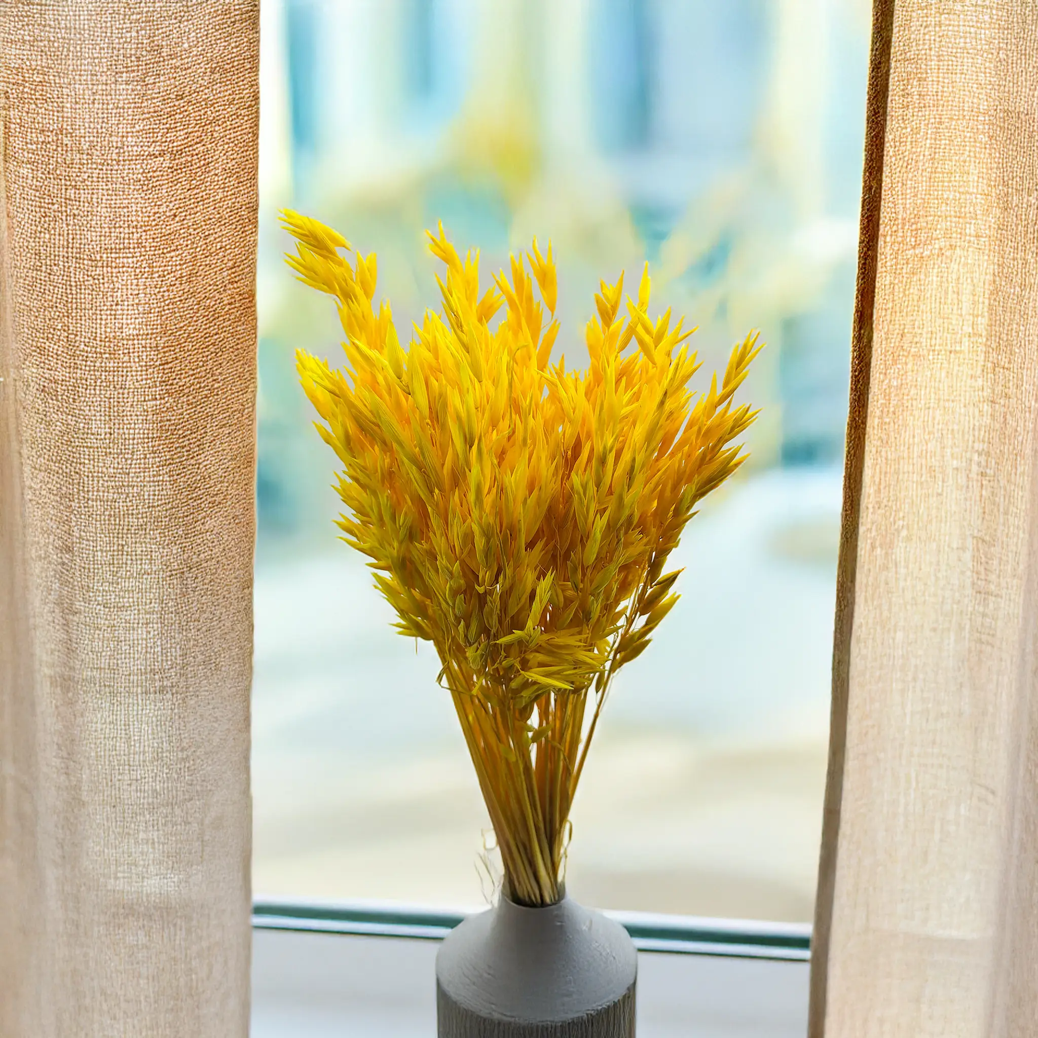 L’avoine séchée jaune apporte une touche vive et ensoleillée aux compositions florales. Sa couleur chaleureuse illumine les bouquets et s’associe parfaitement à différents styles déco.