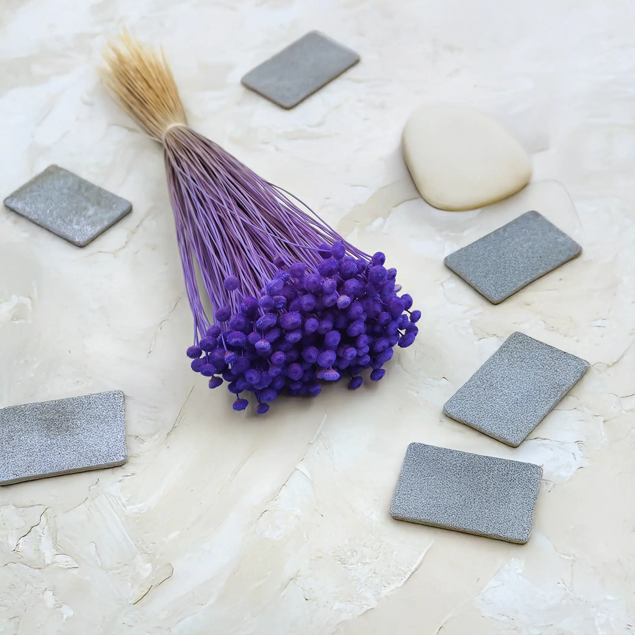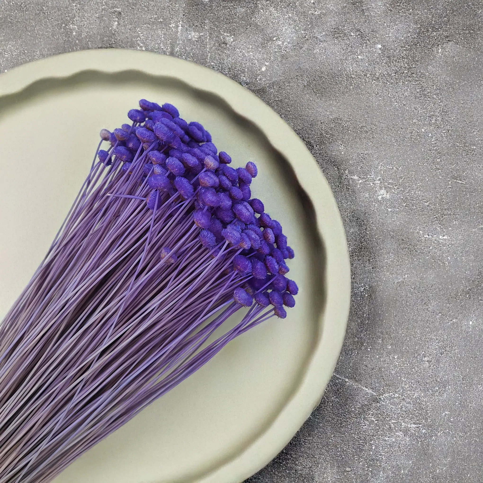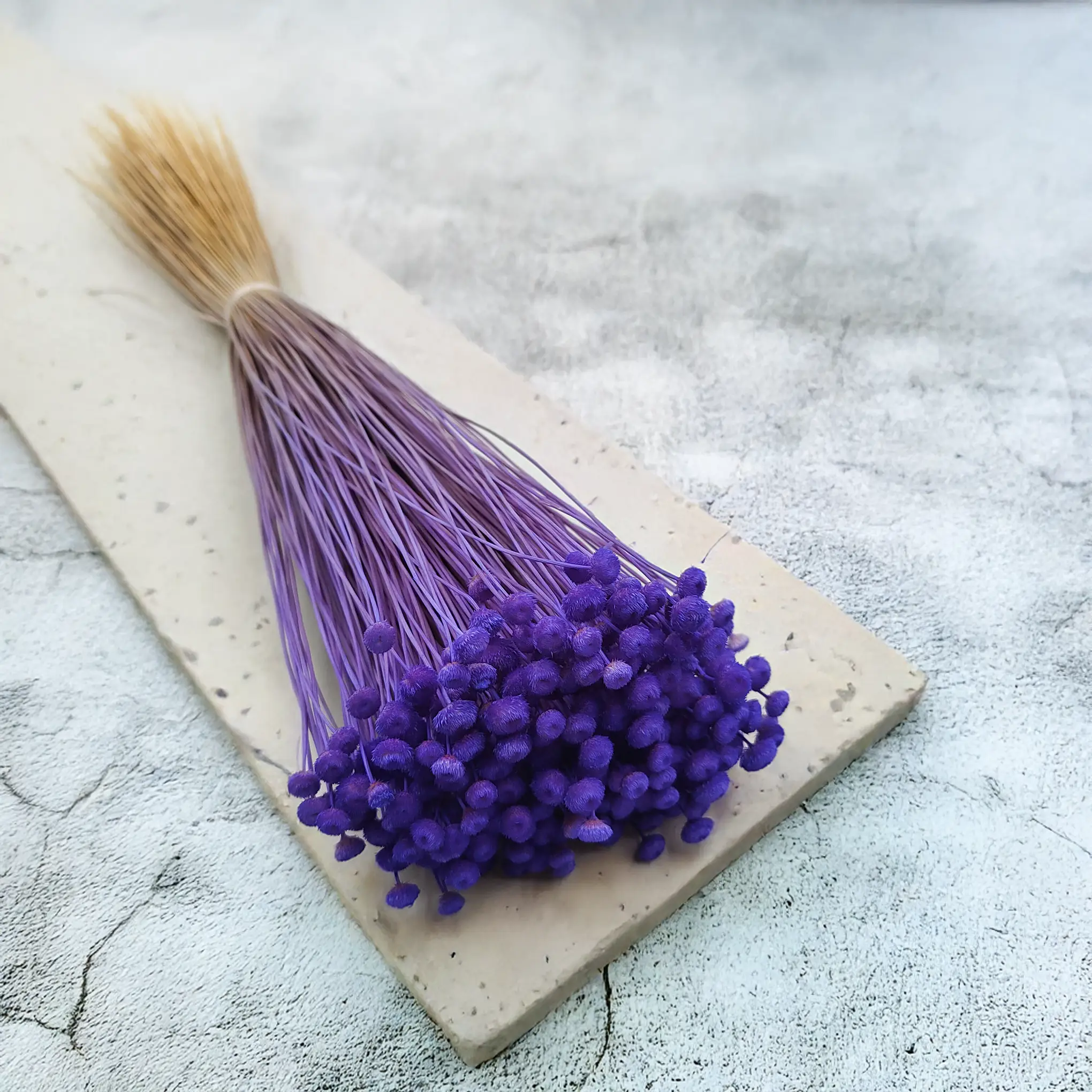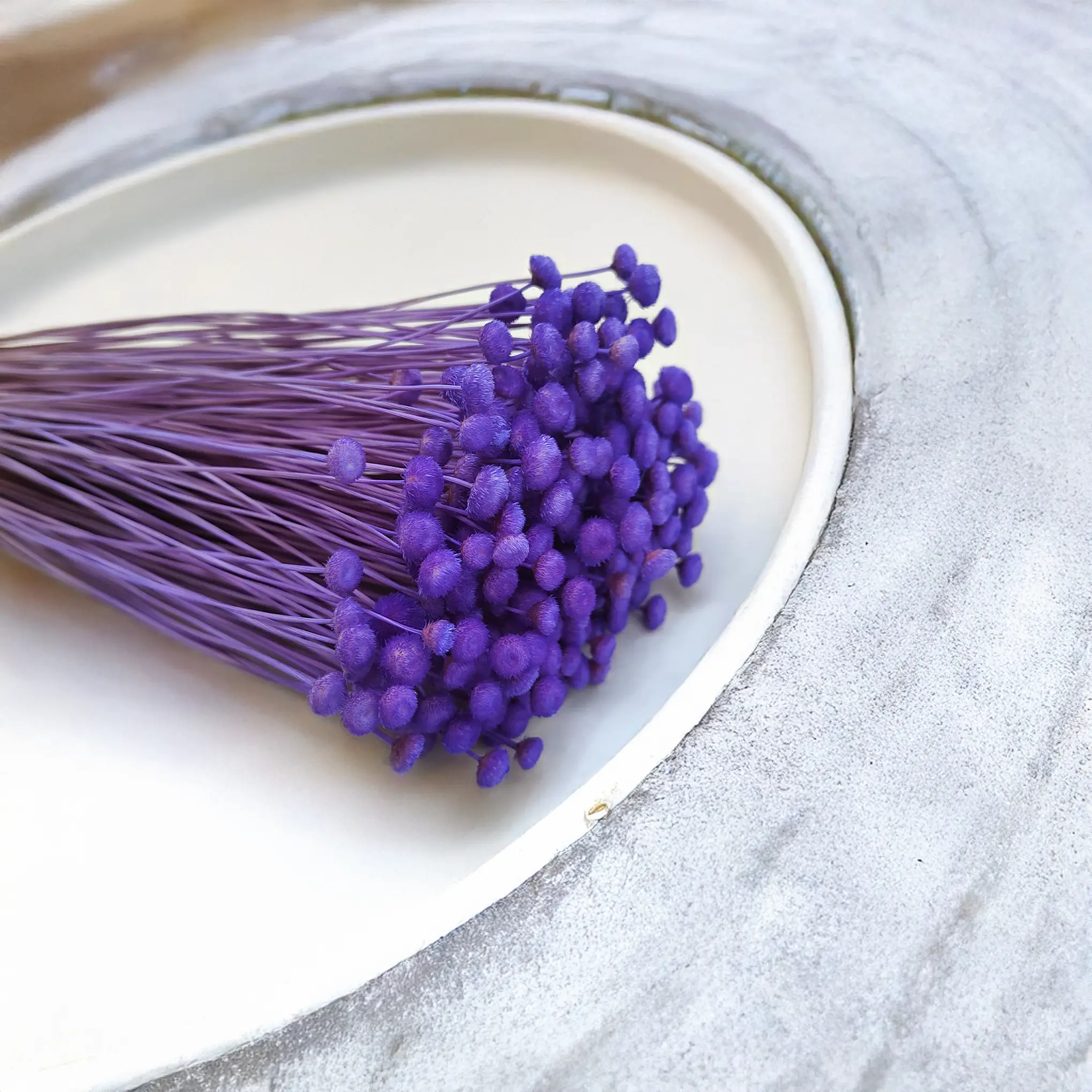 Botao Amarelino en violet bleuet est une fleur séchée rare et élégante avec des têtes arrondies compactes. Originaire d’Amérique du Sud, elle est soigneusement séchée et teintée pour une couleur intense et durable.