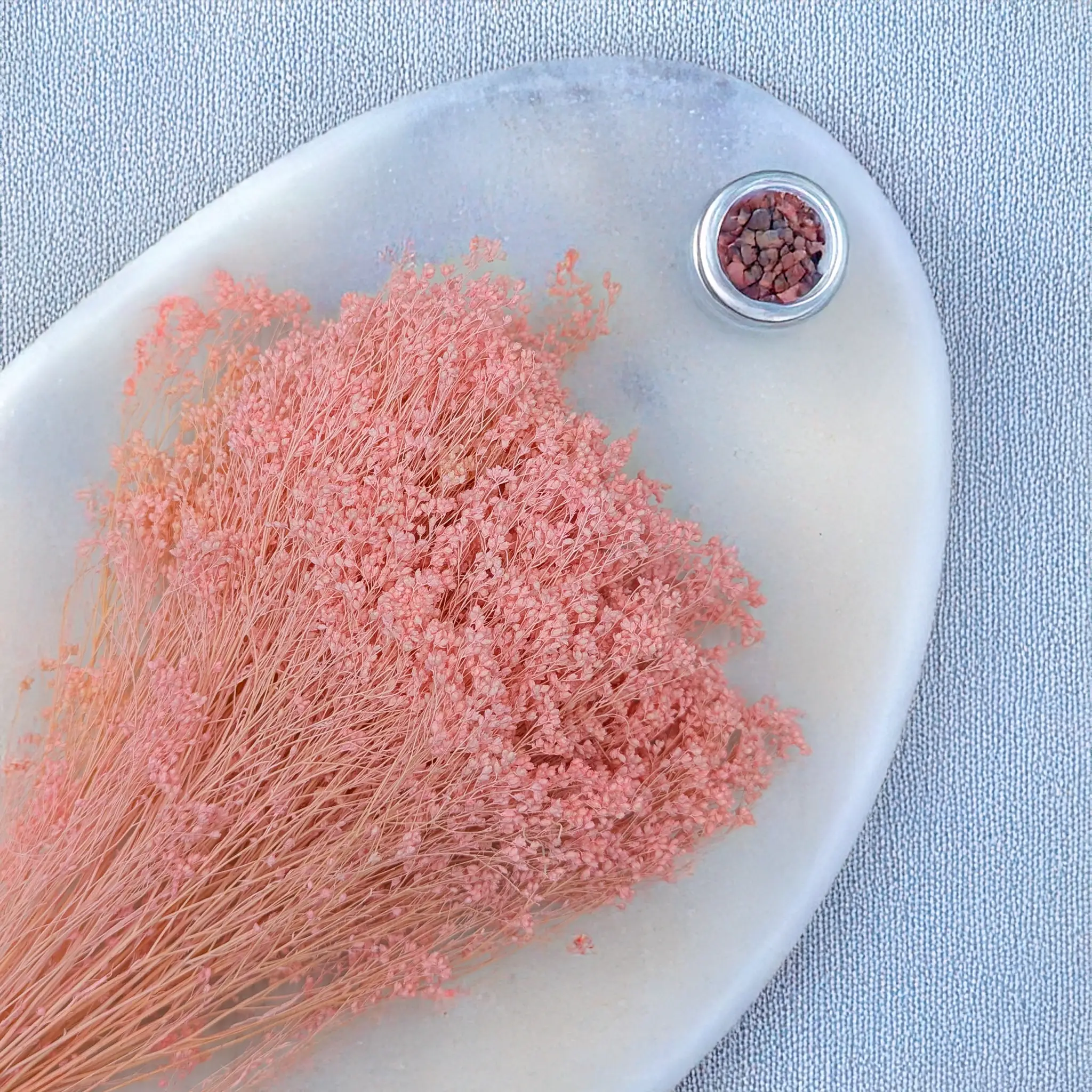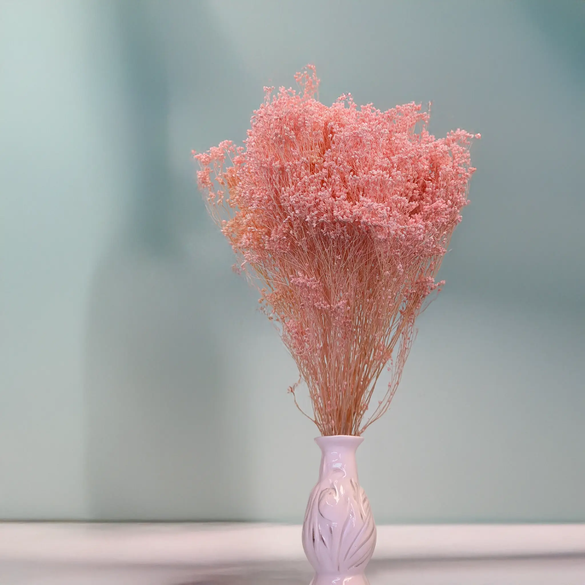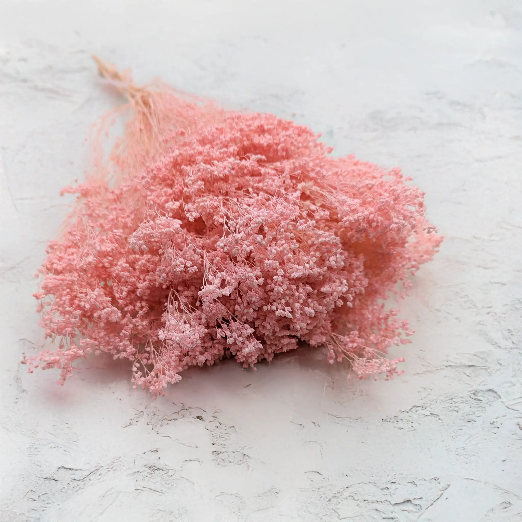 Apparence : Peut atteindre 2 mètres de hauteur, avec des tiges vertes et fines et de petites feuilles. Fleurit en mai–juin. La version rose perle est obtenue par blanchiment et teinture pour un style doux et raffiné.
