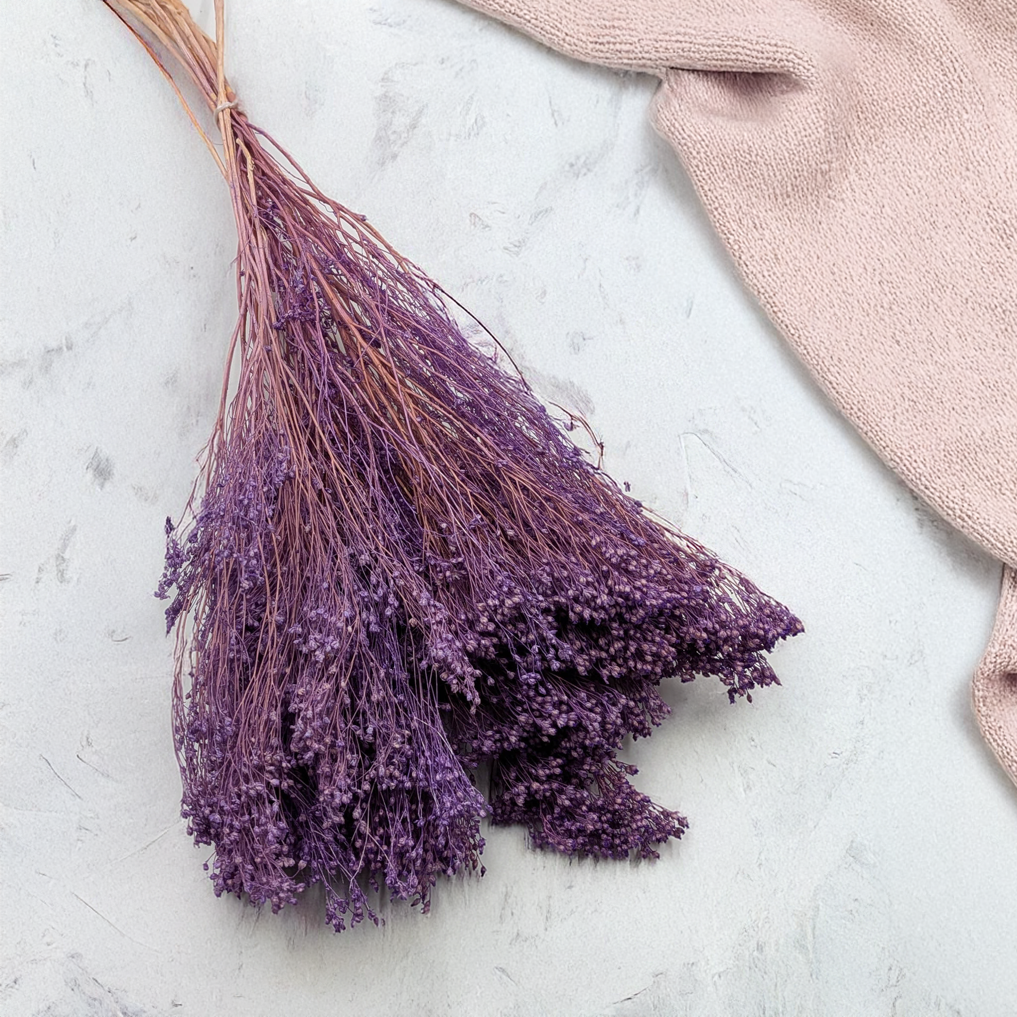 Broom Bloom, ou Cytisus scoparius, est une plante séchée décorative teintée dans une nuance lavande délicate. Ses fleurs duveteuses apportent légèreté et poésie aux compositions bohèmes, rustiques et romantiques.