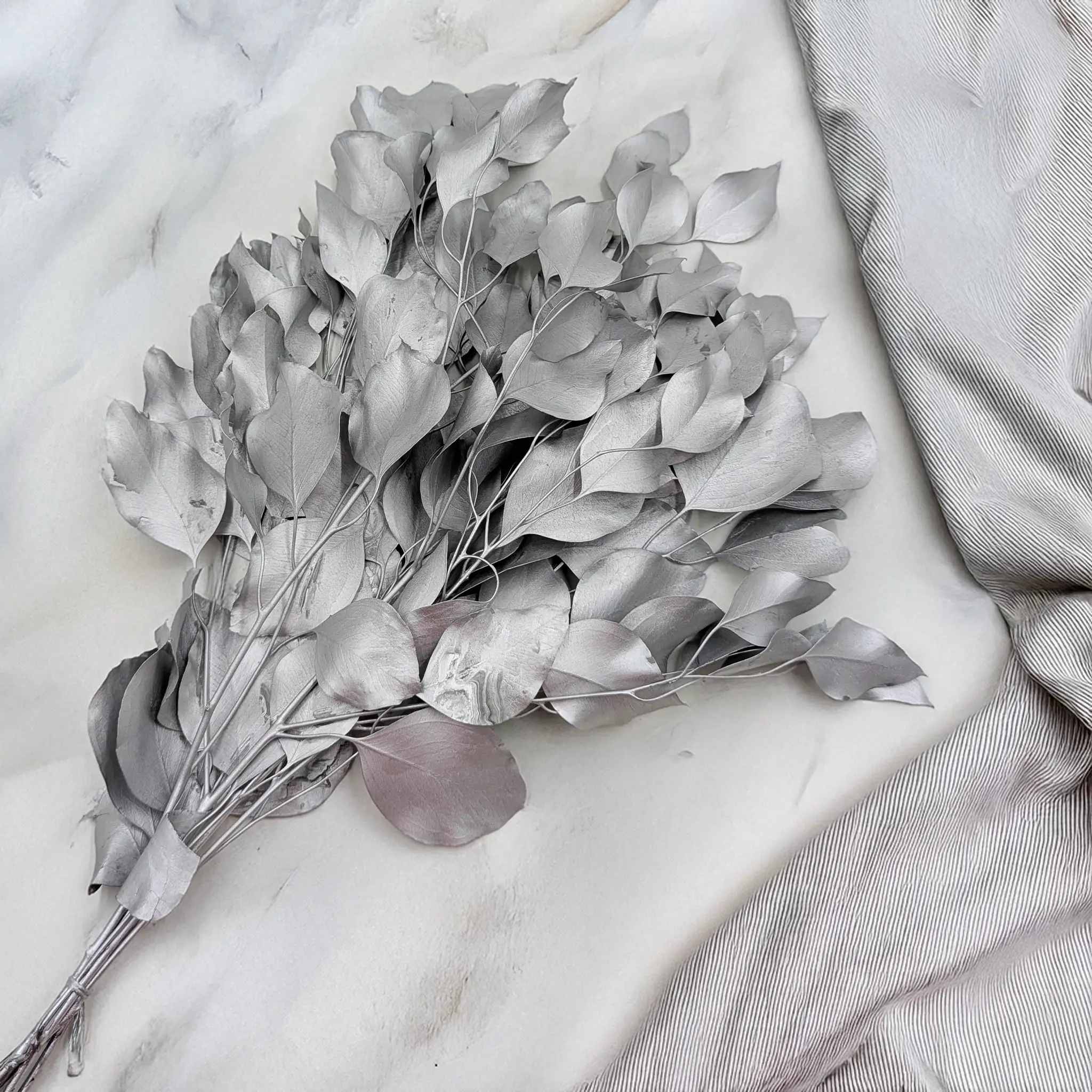 L’eucalyptus stabilisé Populus en teinte argentée est une décoration raffinée et contemporaine. Ses grandes feuilles rondes au reflet métallique apportent structure et éclat aux compositions florales. Idéal pour les bouquets d’hiver, guirlandes, centres de table et décorations de Noël. Il s’intègre parfaitement dans les ambiances glamour, japandi et scandinaves.