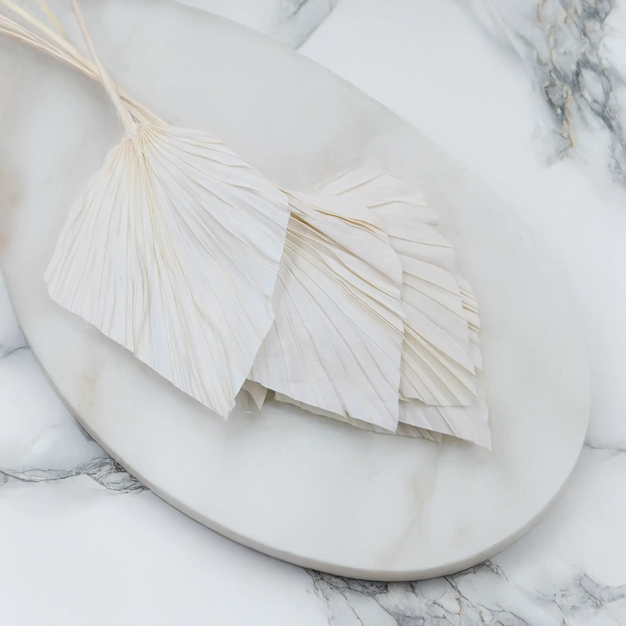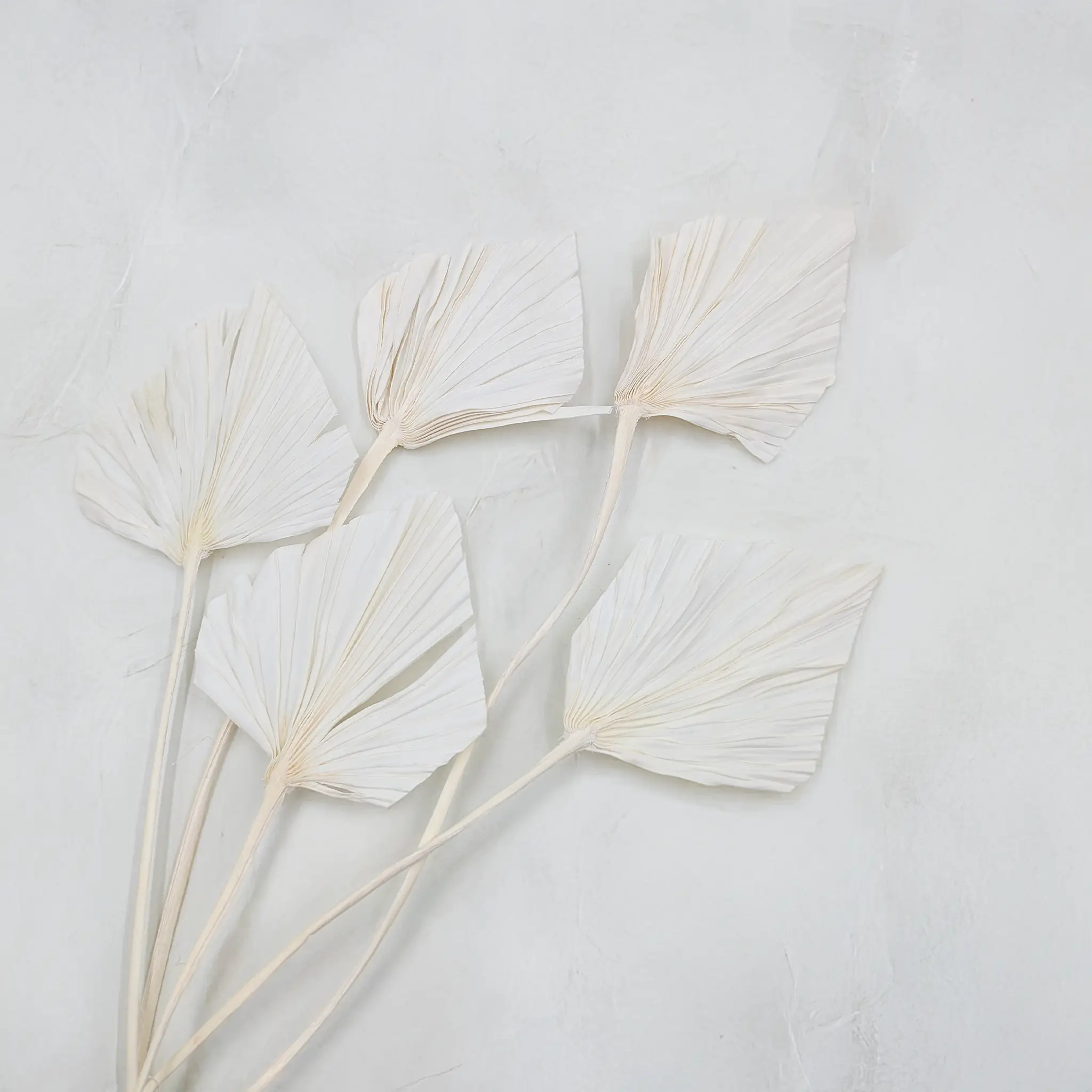 Feuilles de palmier coupées palm spear de couleur blanche, blanchies, également appelées éventail ou flèche de palmier. Le bouquet contient 5 pièces. Leur utilisation la plus courante est la décoration de gâteaux – en particulier les gâteaux de mariage ou de fête – ainsi que pour les compositions florales, les centres de table et les bouquets secs.