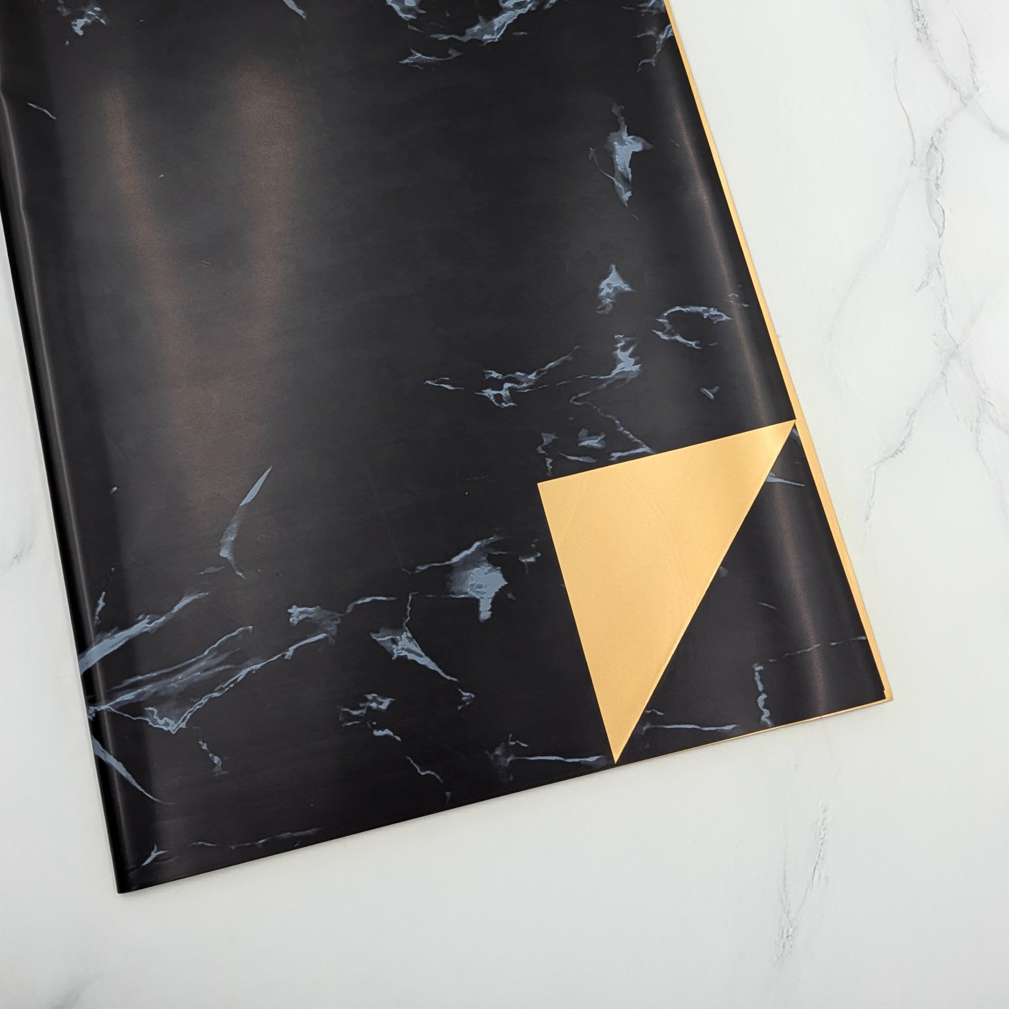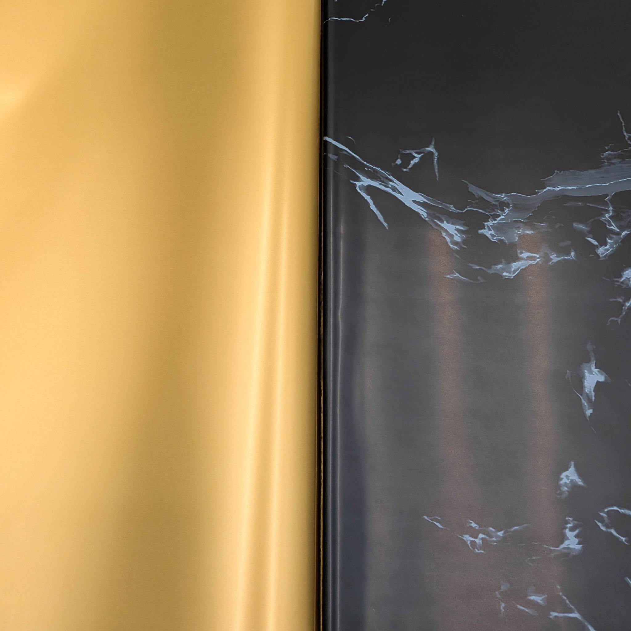 Stone&Shine en noir est un film floral double face conçu pour des compositions audacieuses et luxueuses. Une face présente un motif marbré élégant en noir profond, tandis que l’autre face est lisse et dorée, offrant un contraste sophistiqué et premium.