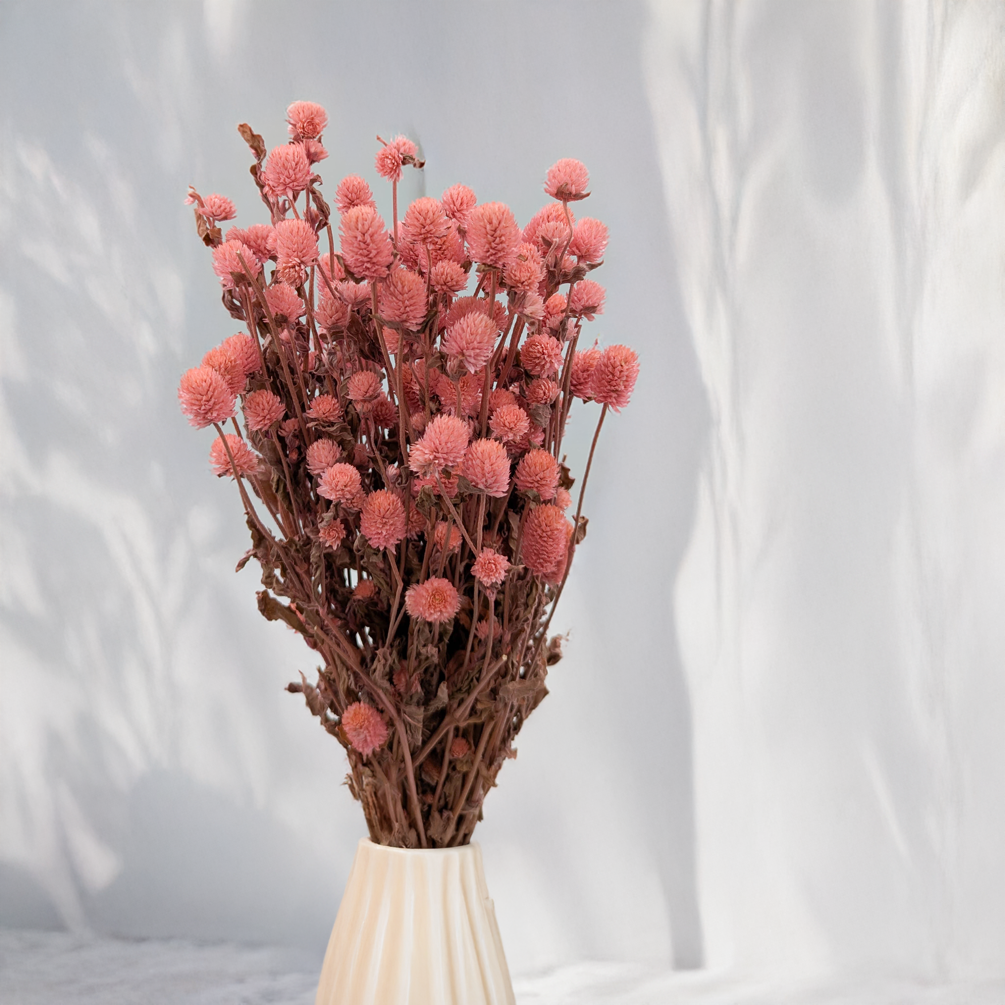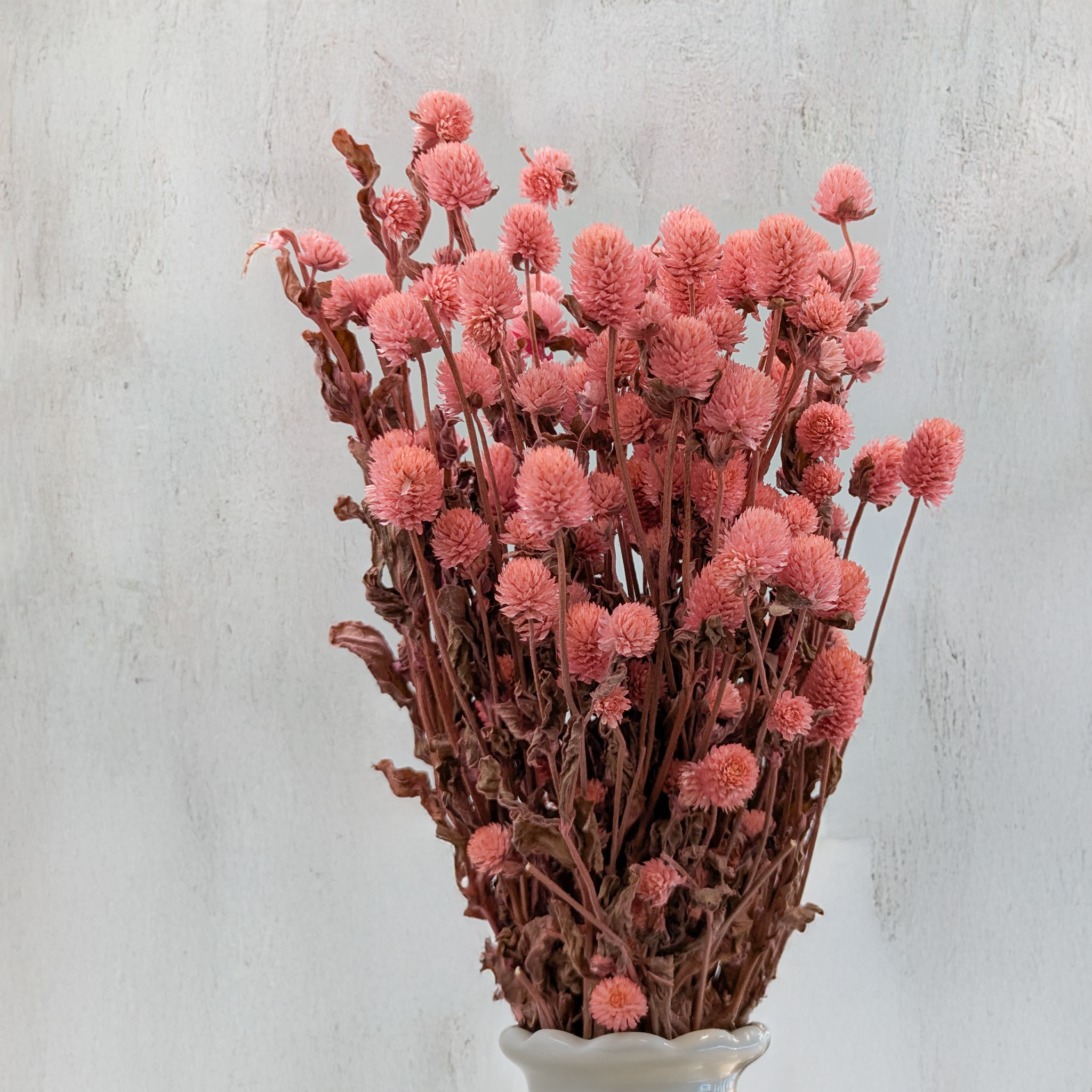 La gomphrena globosa séchée dans une teinte rose douce est un accent décoratif unique qui allie beauté naturelle et élégance délicate. Ses têtes florales rondes et pastel apportent chaleur, tendresse et féminité aux compositions, s’intégrant parfaitement dans les styles bohème, vintage et rustique.