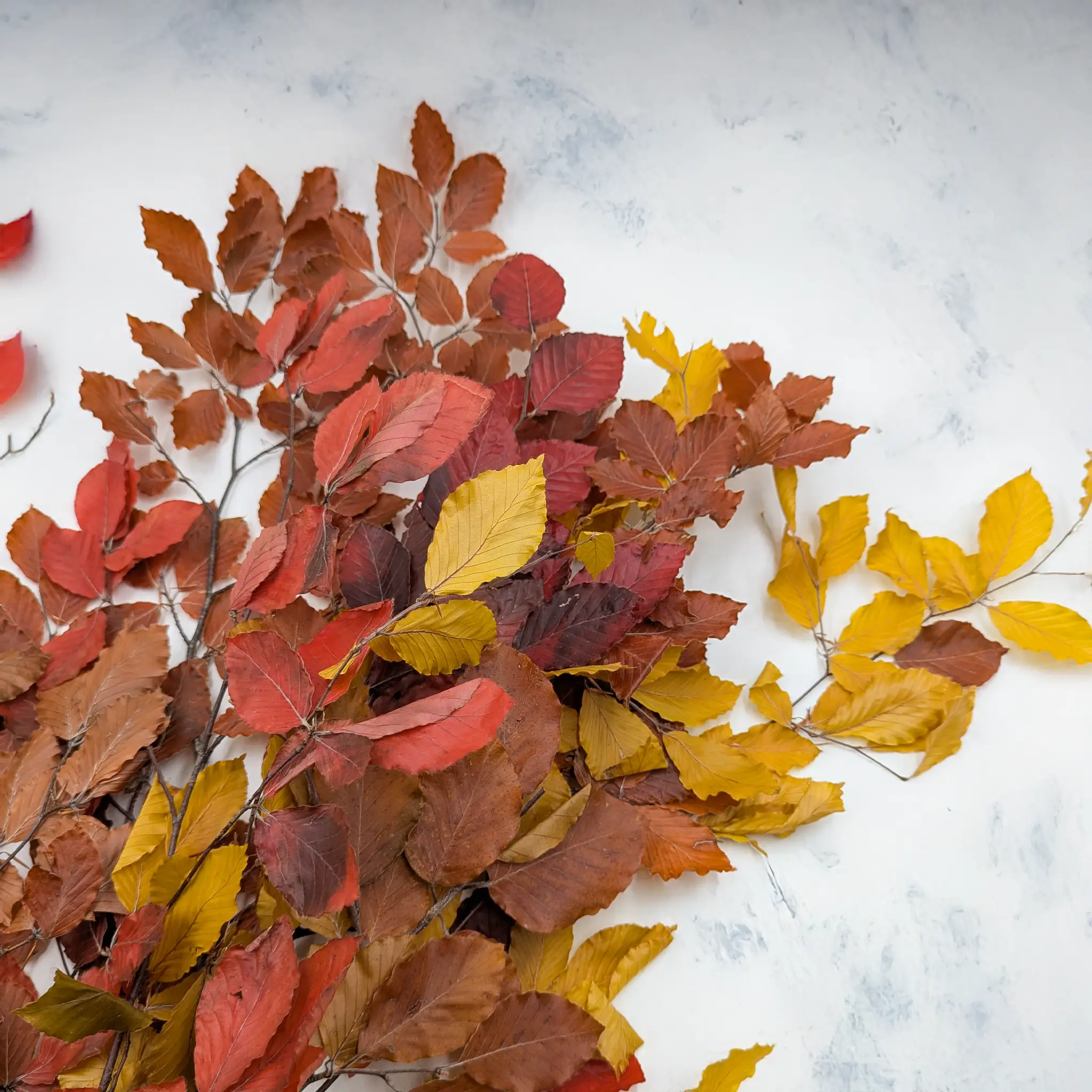 Le hêtre stabilisé en mélange d’automne combine des teintes chaleureuses de rouge, d’orange, de jaune et de brun. Cette palette naturelle évoque toute la beauté de la saison, apportant douceur et authenticité aux compositions florales et aux décors rustiques.