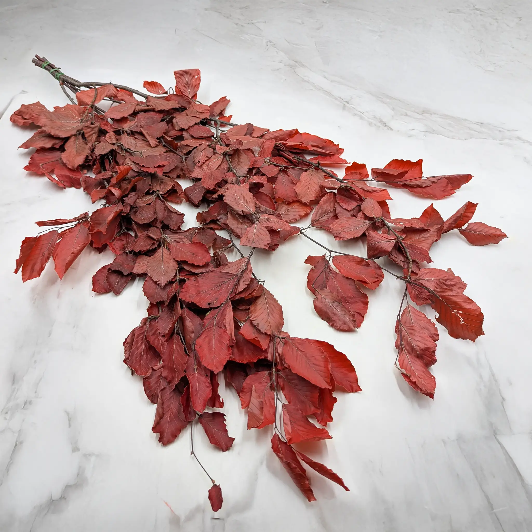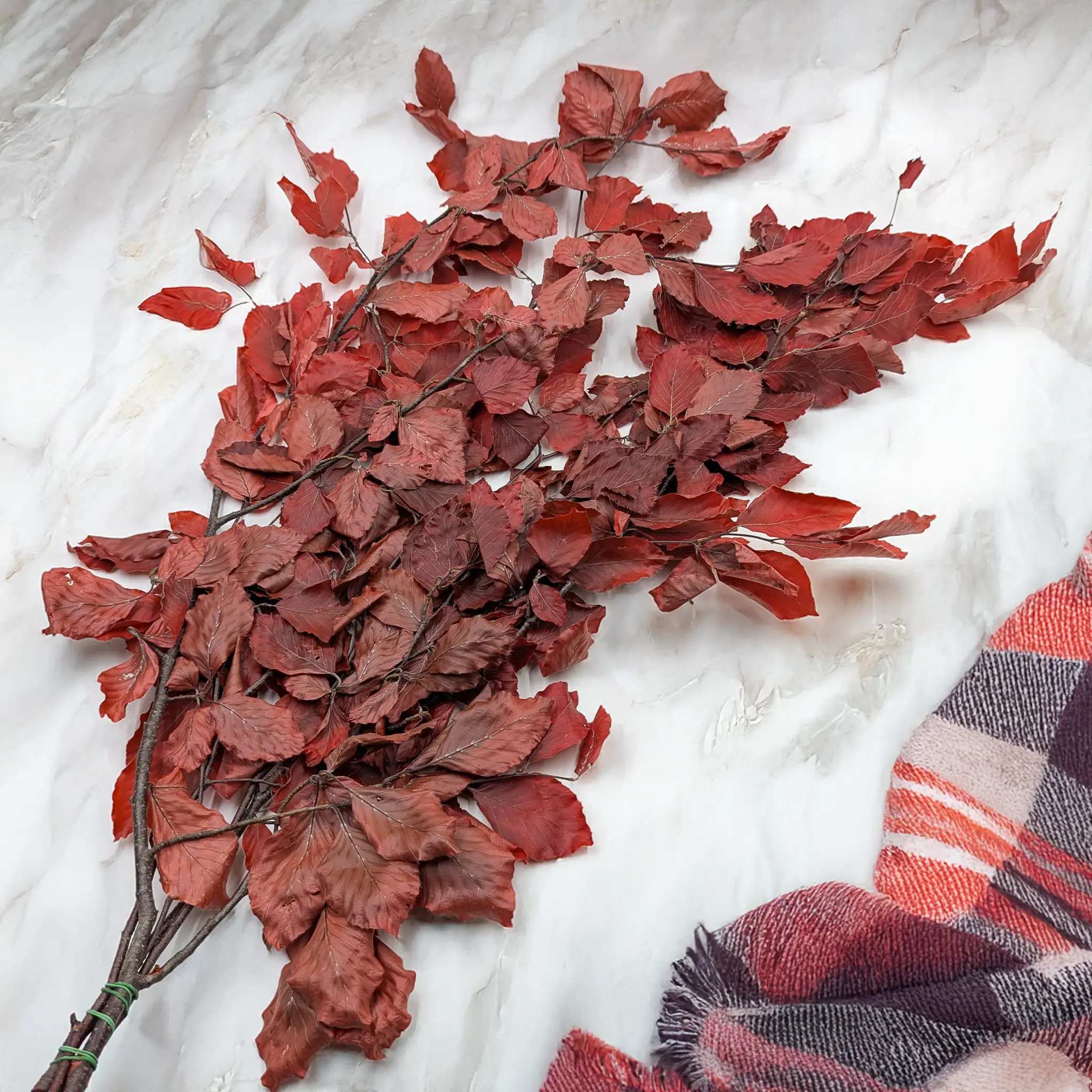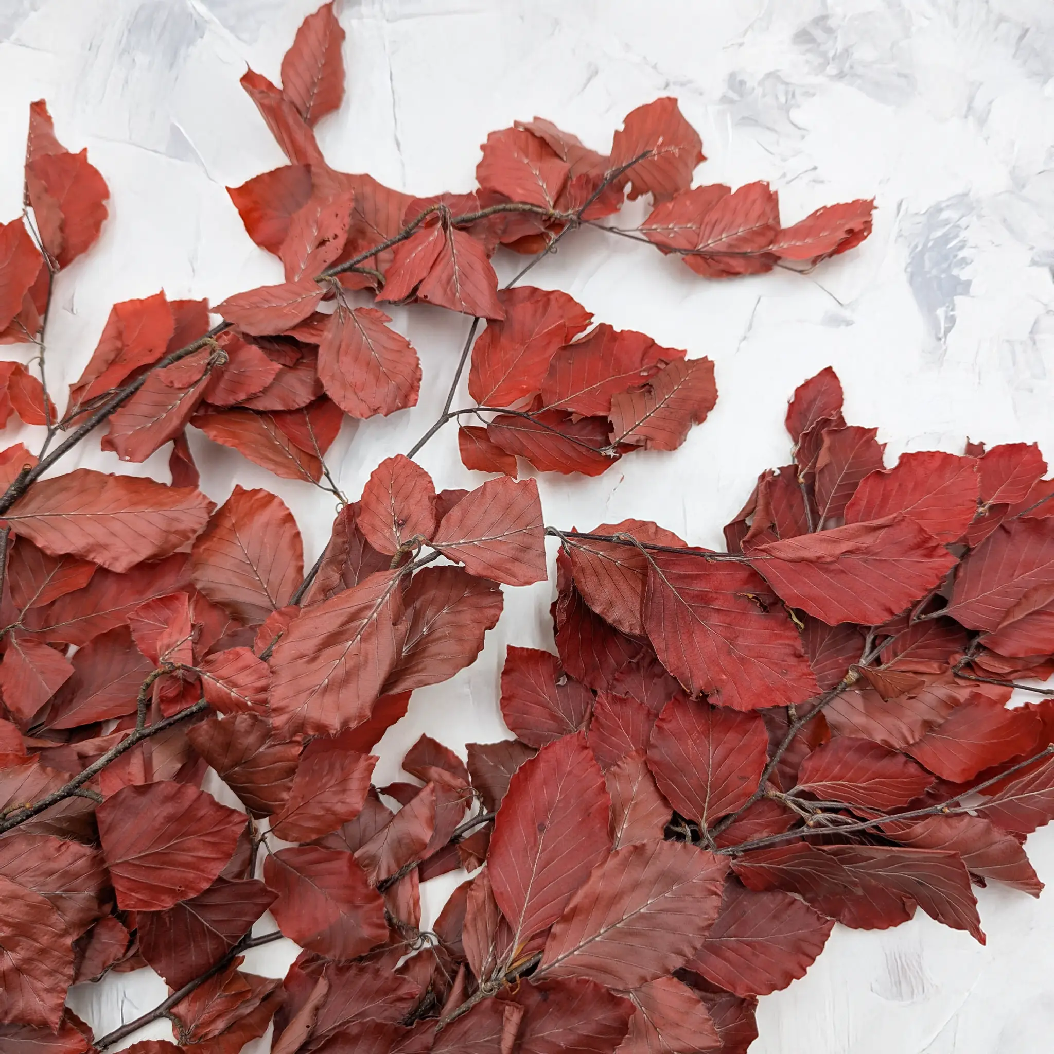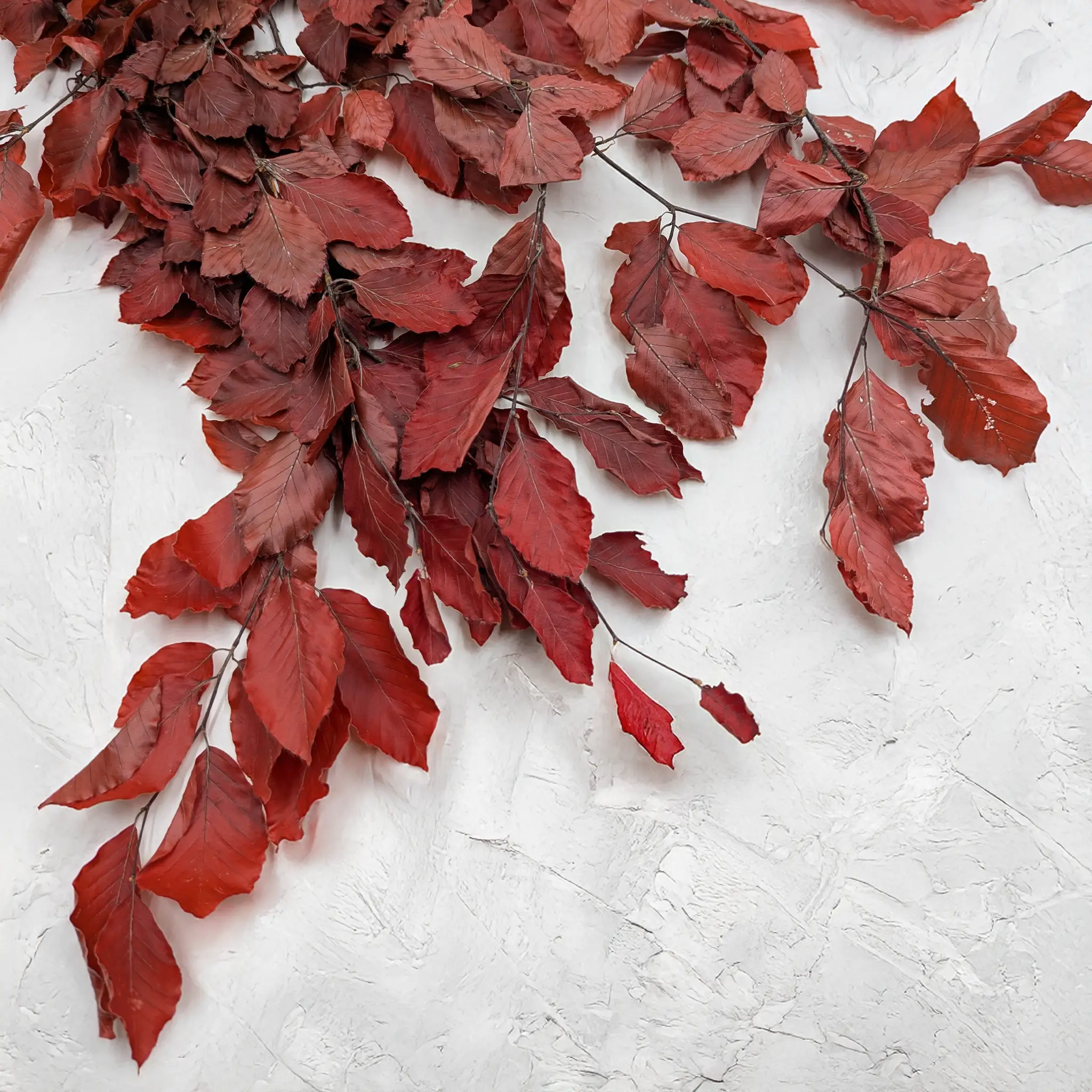 Le hêtre stabilisé de couleur rouge est une touche automnale classique pour les compositions florales. Sa teinte douce et légèrement atténuée apporte chaleur et élégance, idéale pour les décors rustiques, boho et japandi.