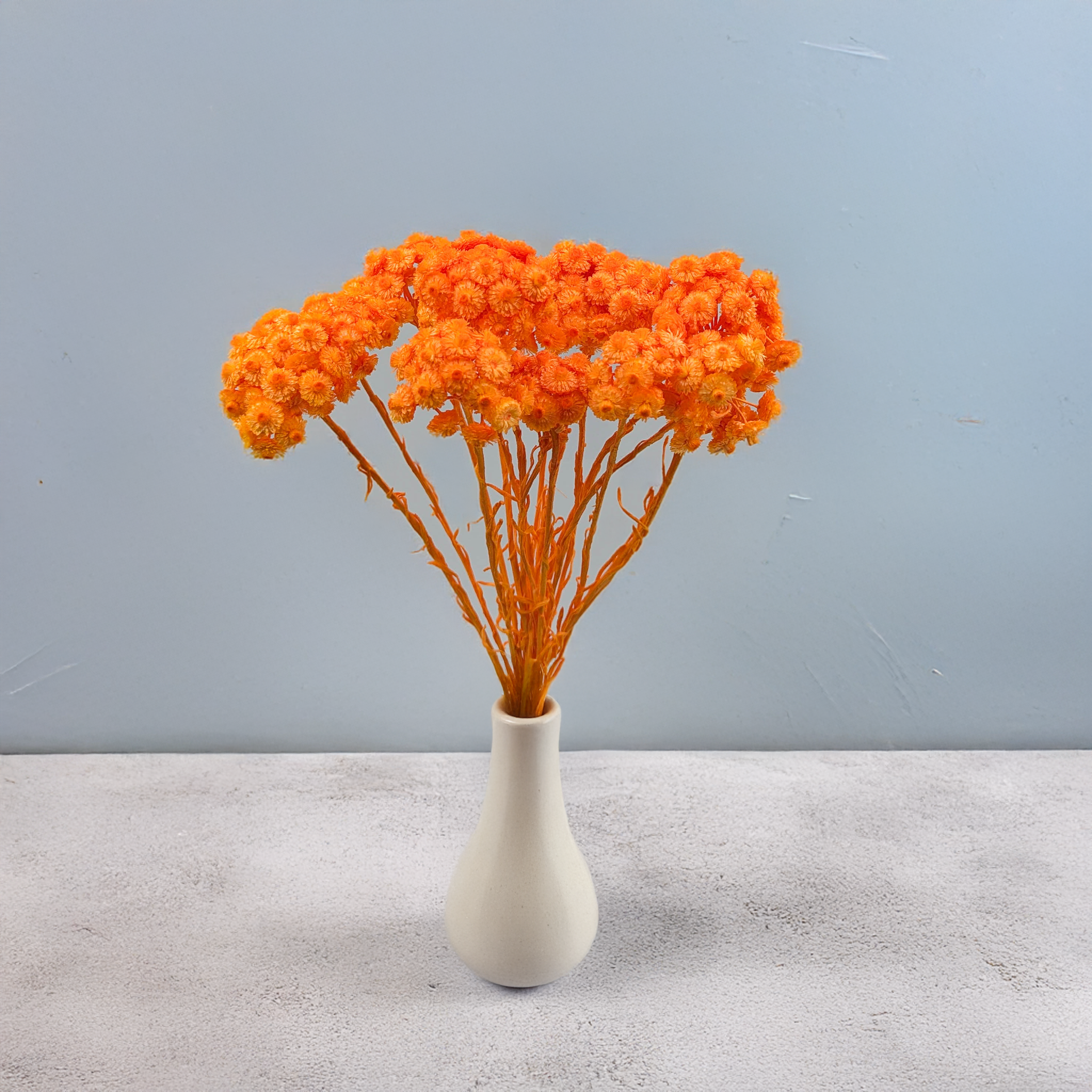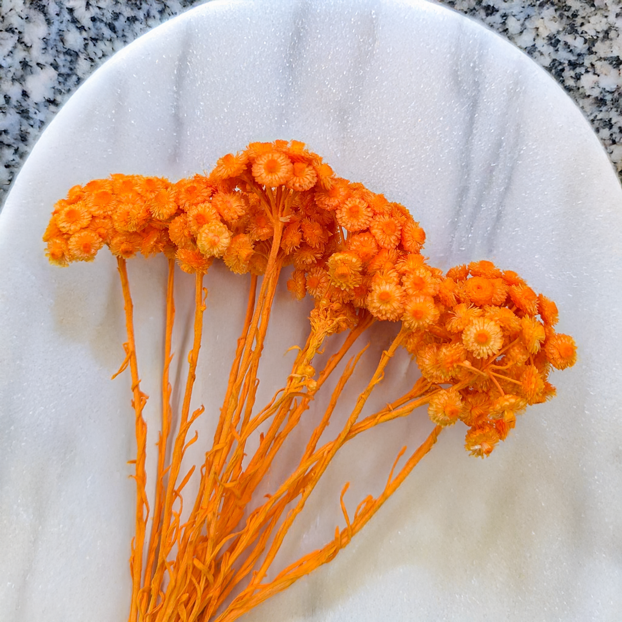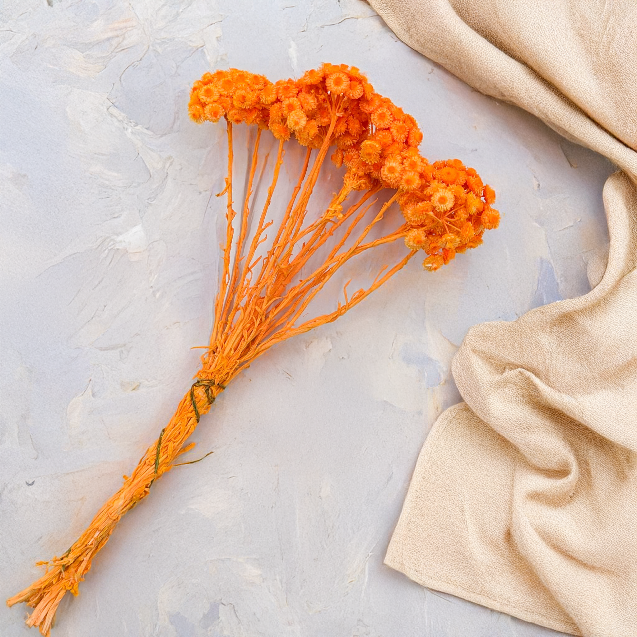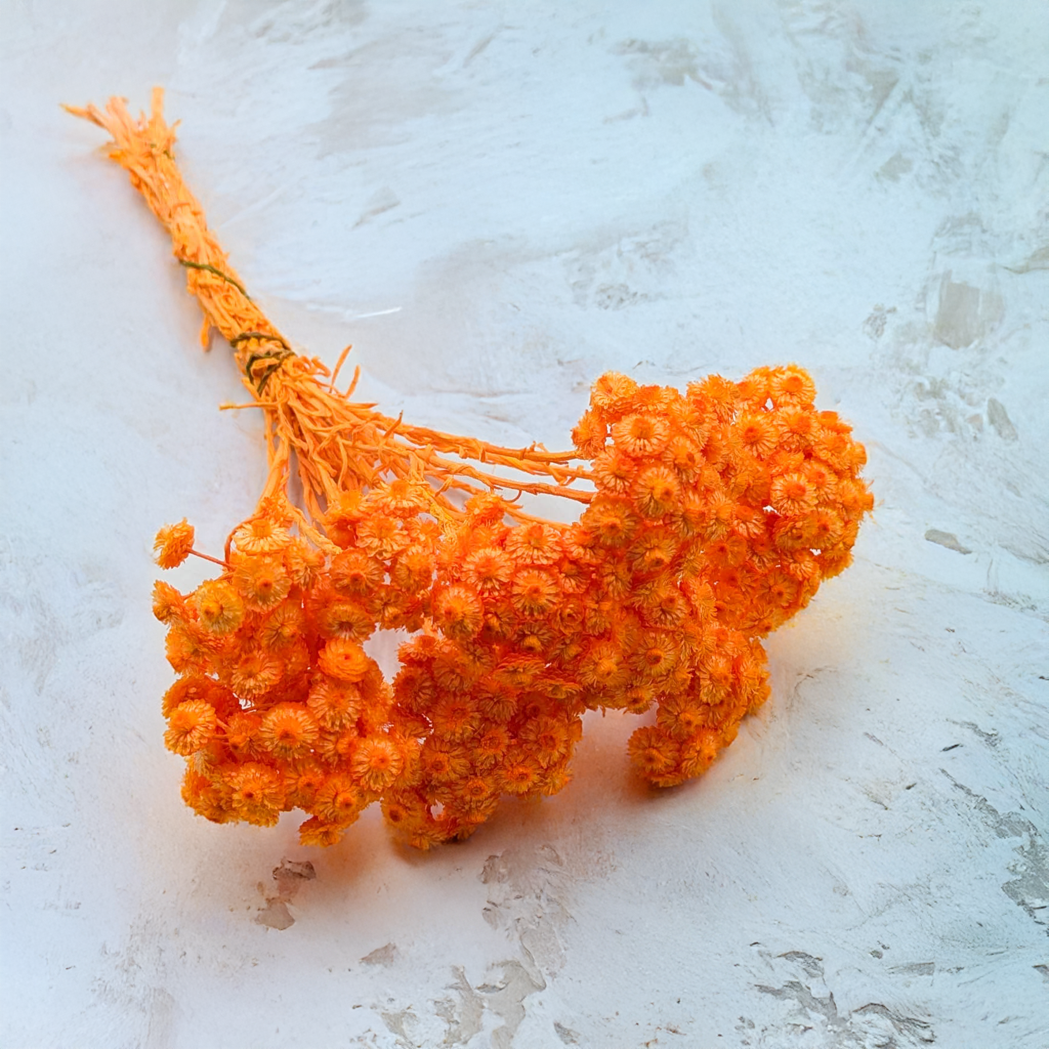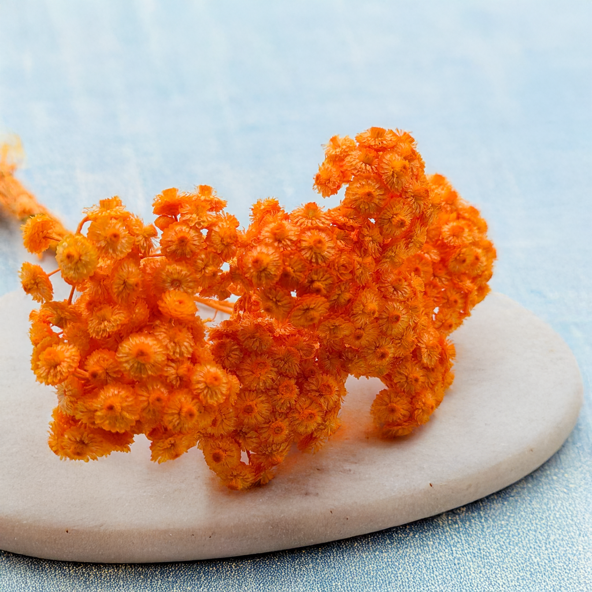 L’hélichryse italienne séchée de couleur orange intense est un accent décoratif qui apporte chaleur, joie et vitalité à tous les espaces. Sa texture sèche et rigide la rend idéale pour des compositions durables et expressives.