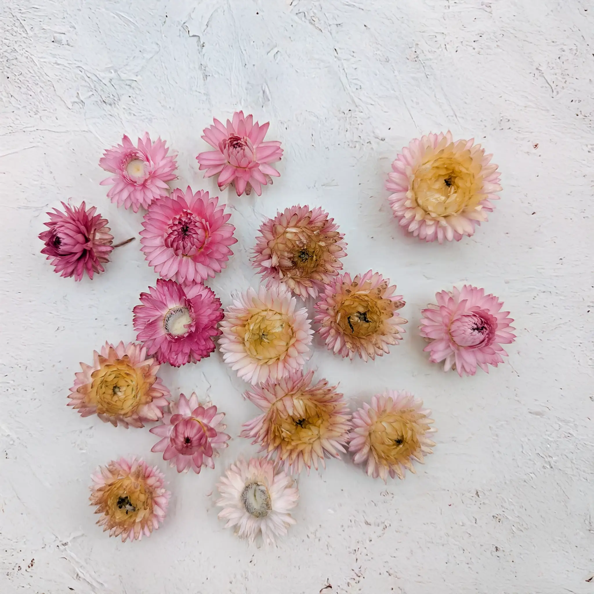 Les têtes d’immortelles séchées (Helichrysum) sont un matériau naturel apprécié des fleuristes et des artisans. Leurs nuances de rose foncé apportent authenticité et élégance aux créations, tout en restant durables et sans entretien.