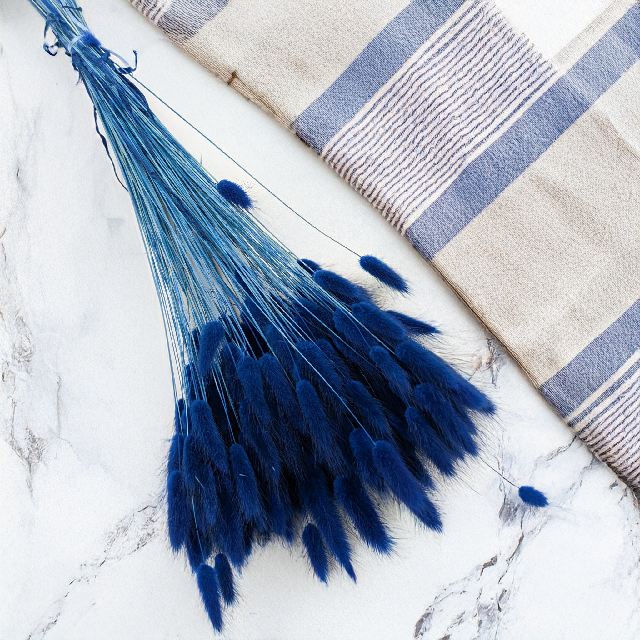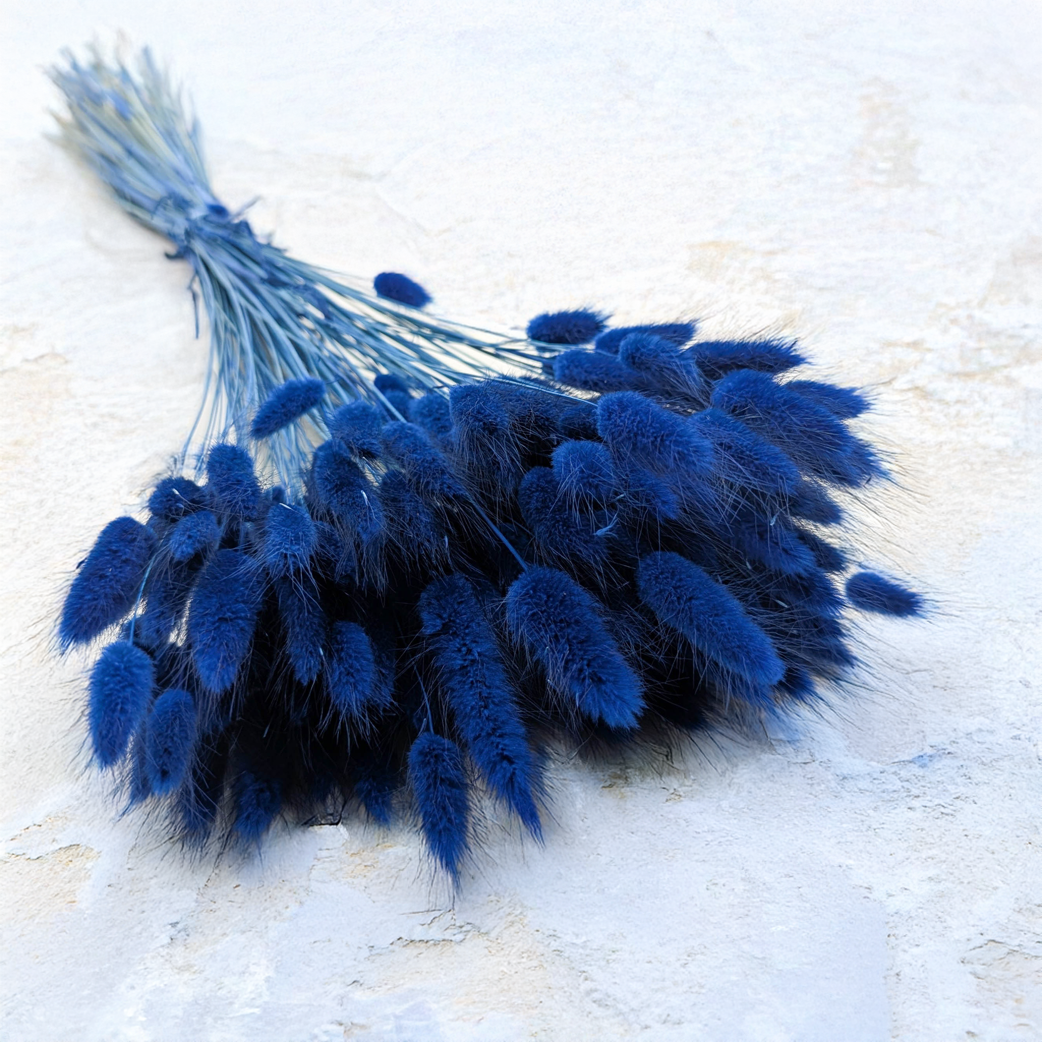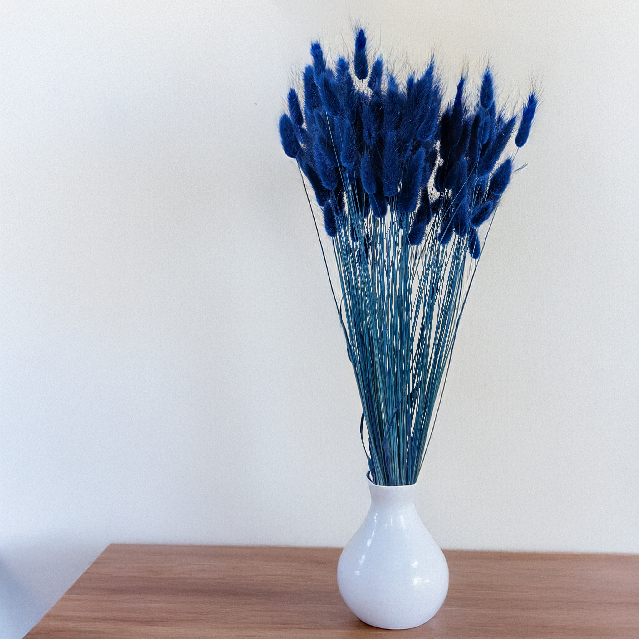 Le Lagurus séché bleu foncé est une version intense et marquée de la queue-de-lièvre classique. Cette teinte symbolise la profondeur, la sérénité et l’élégance – souvent associée au ciel nocturne ou aux abysses marines. Idéal pour les arrangements sophistiqués, mais aussi pour les projets nécessitant un fort contraste et une saturation de couleur.