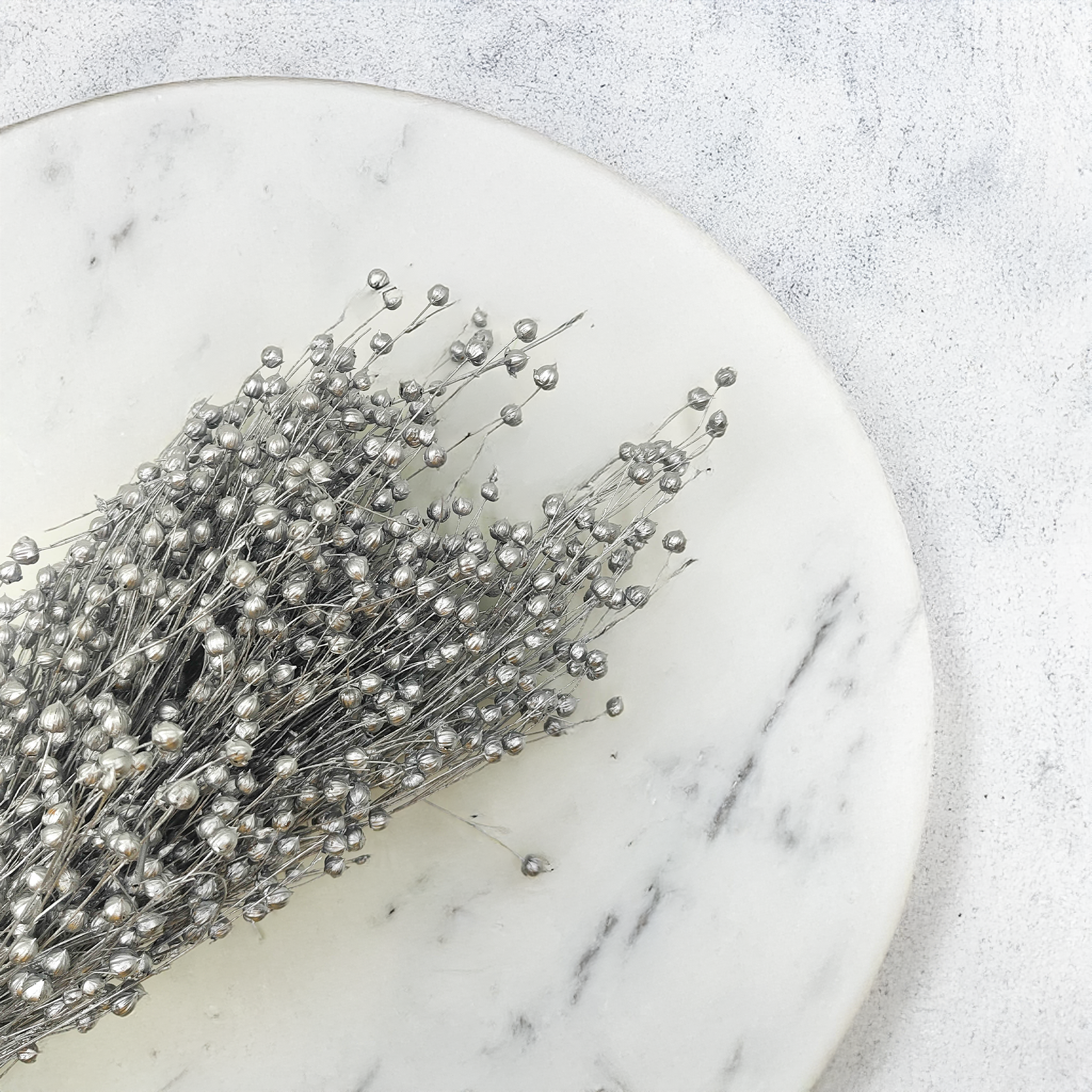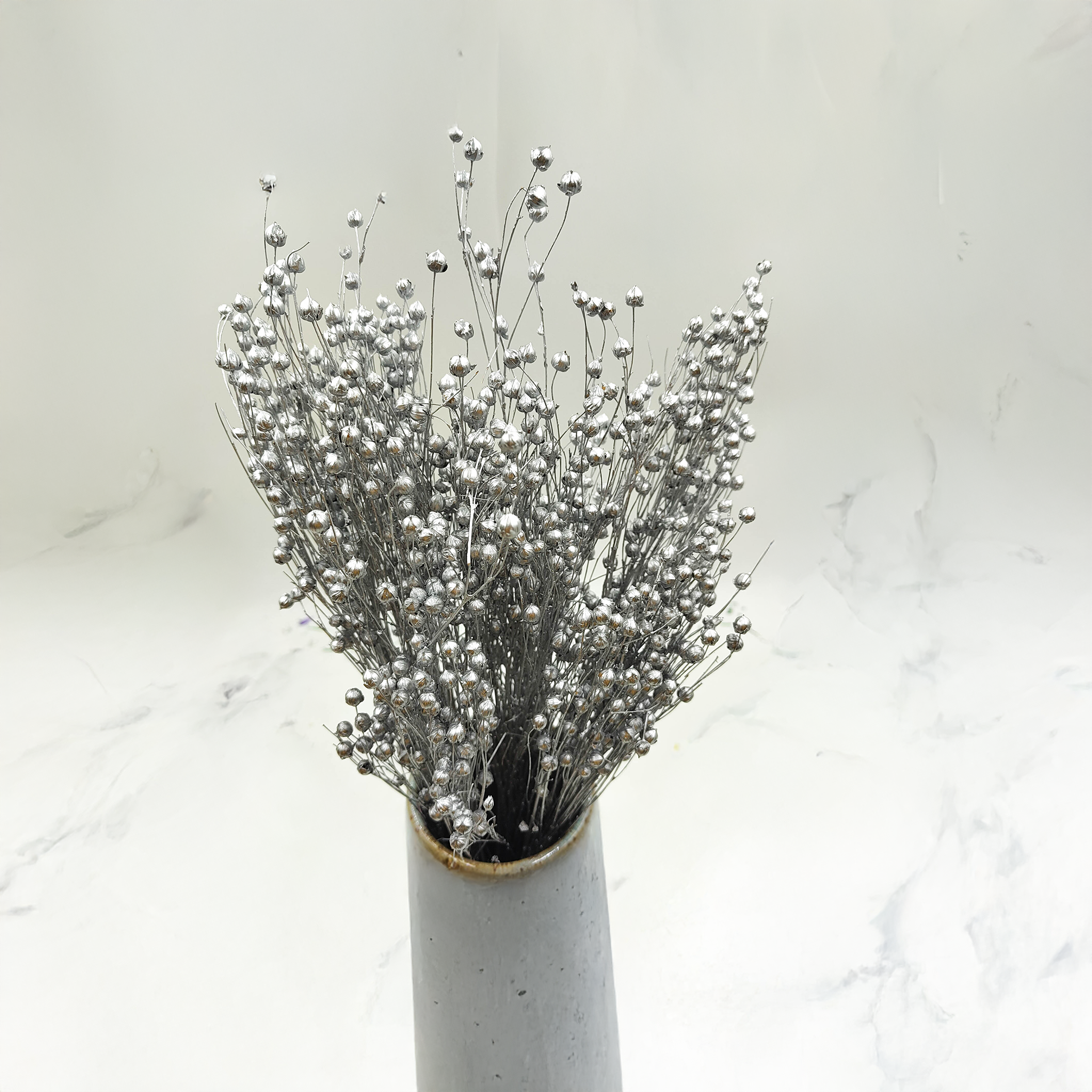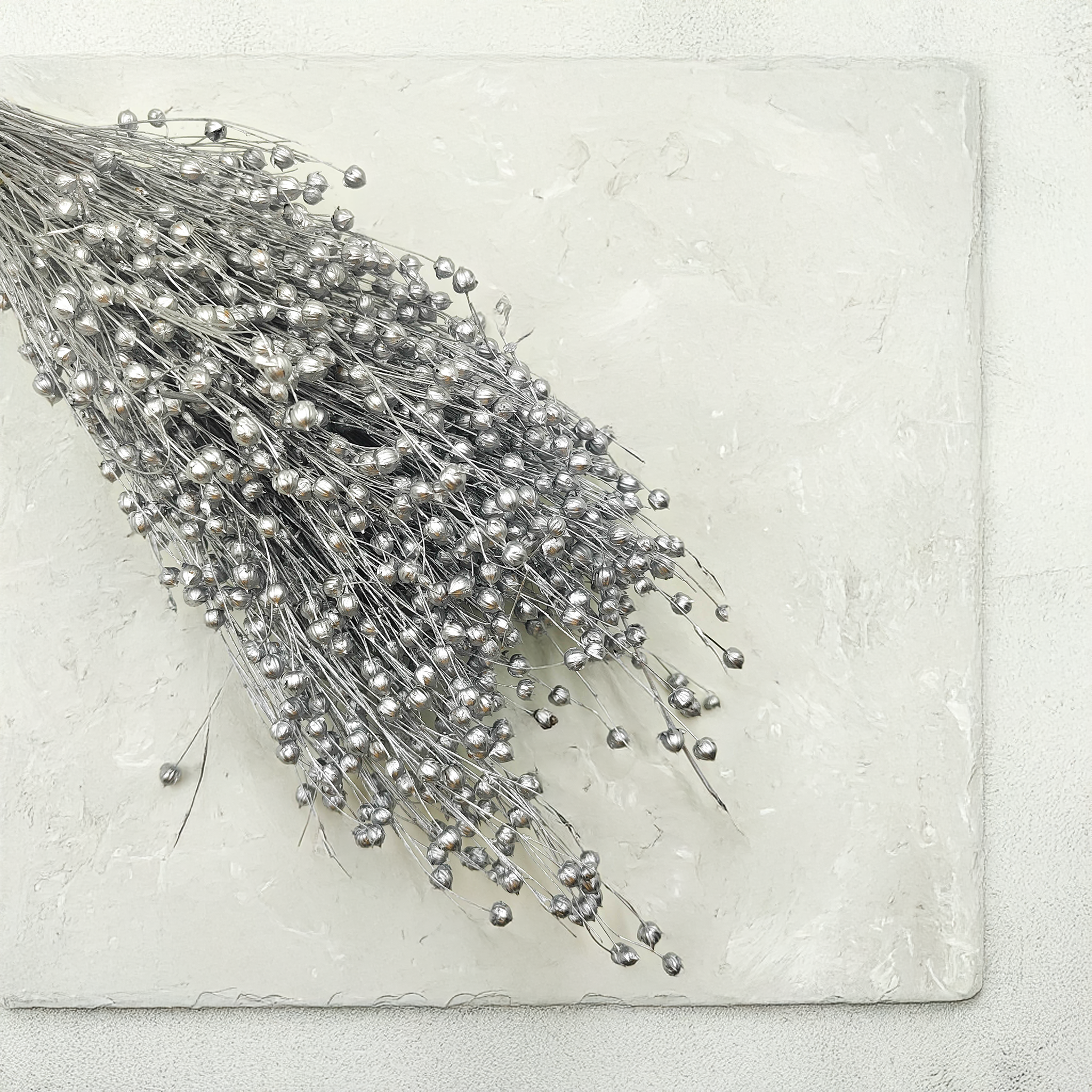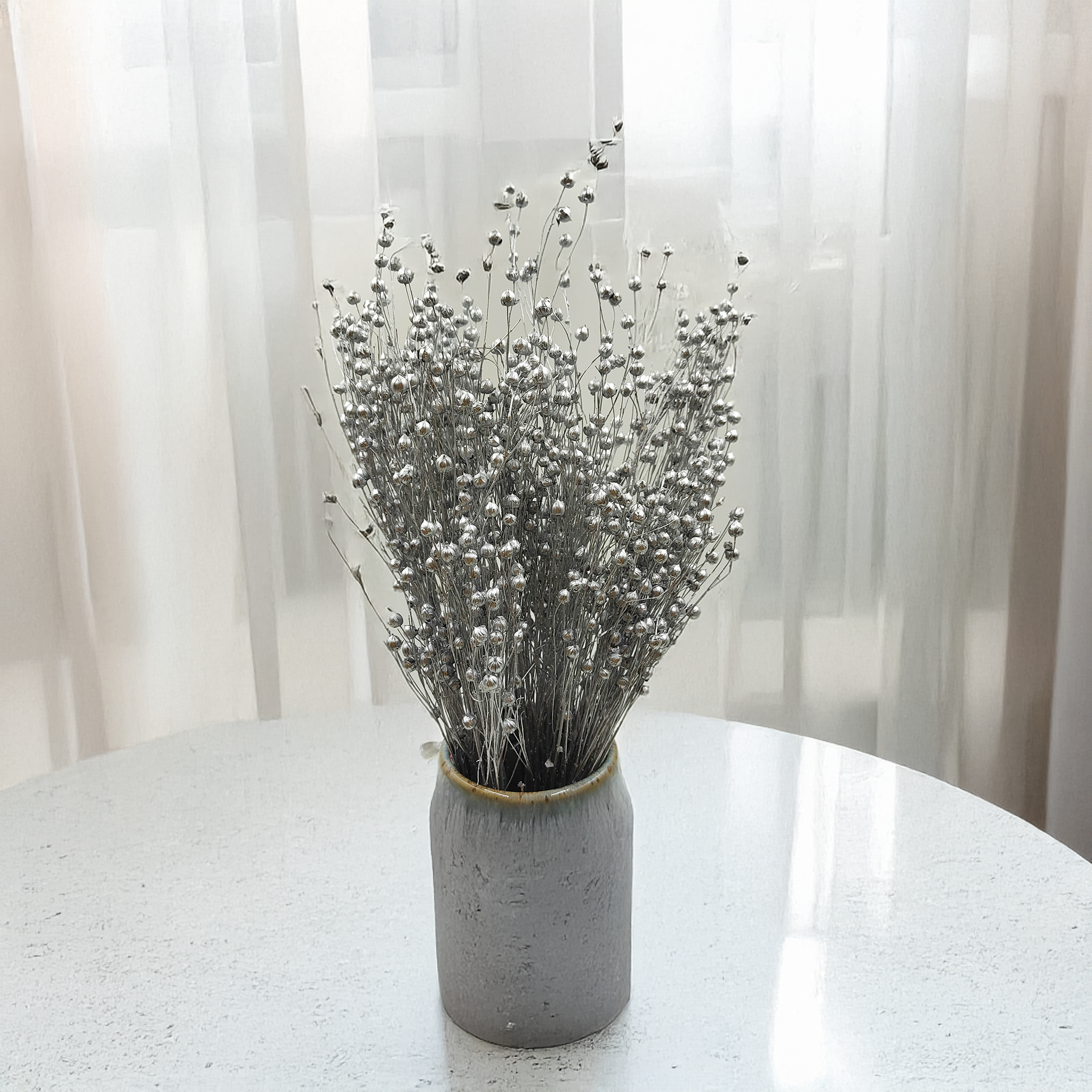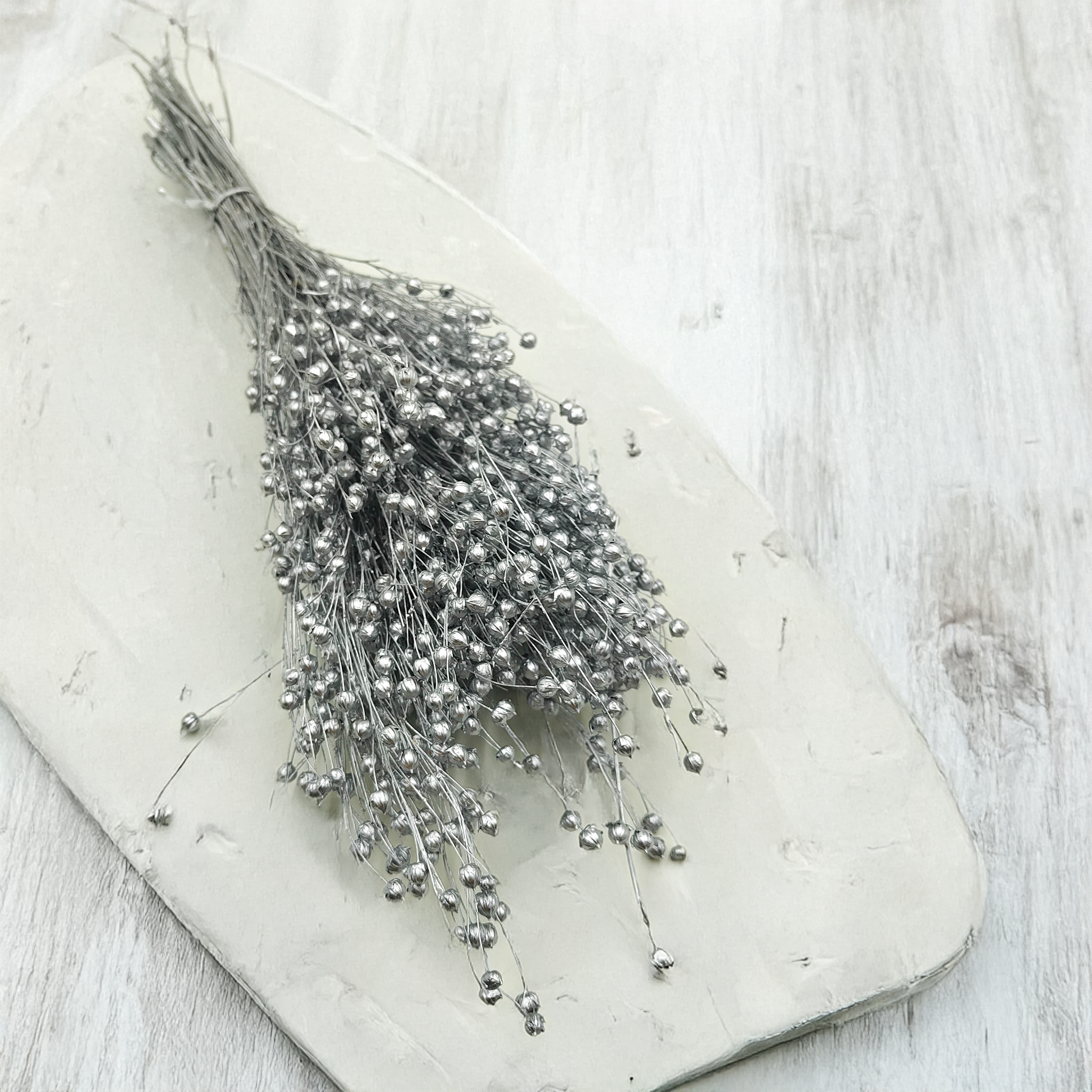 Le lin séché argenté combine l’aspect naturel de la plante avec une finition métallique raffinée. Il s’intègre parfaitement dans les ambiances glamour, modernes ou festives.