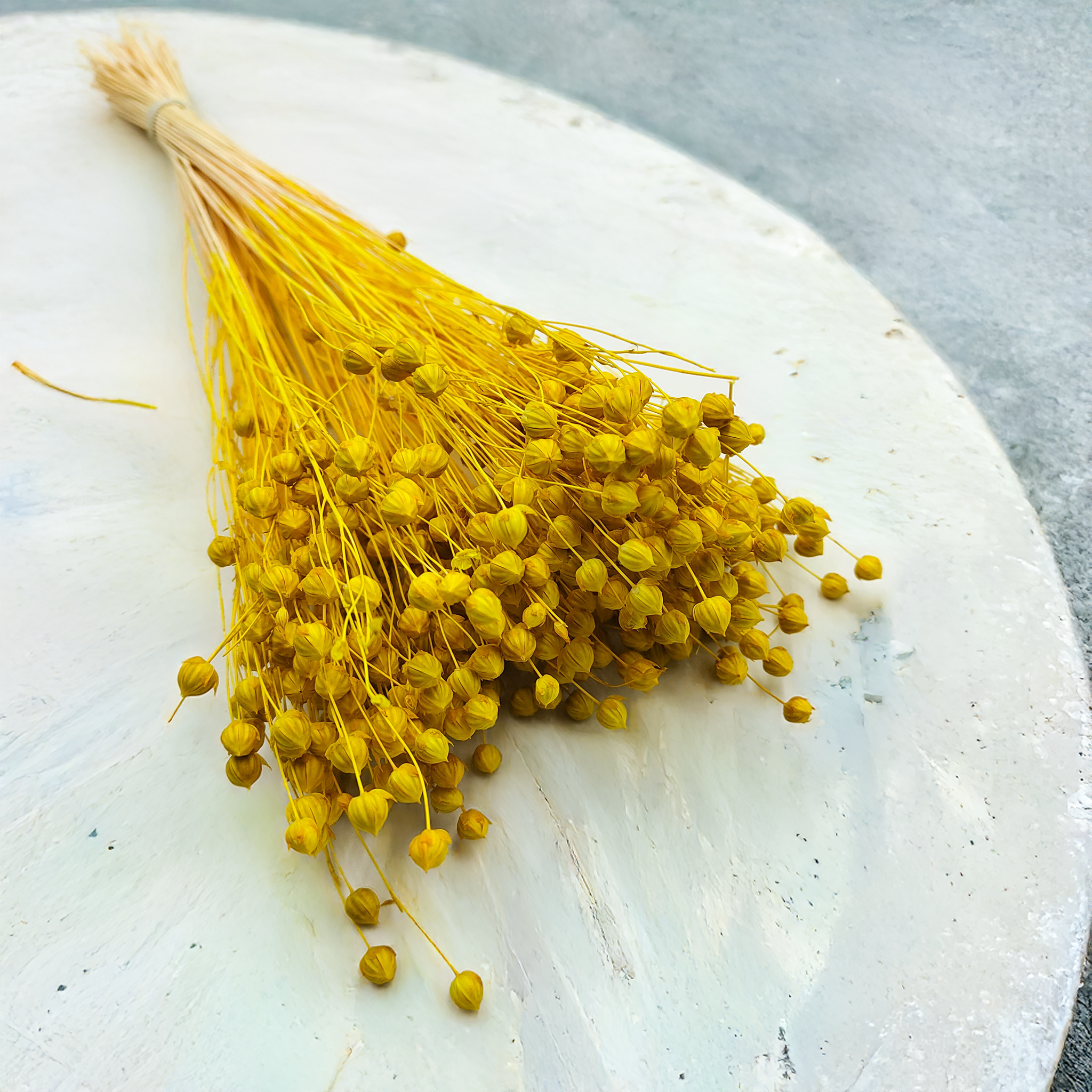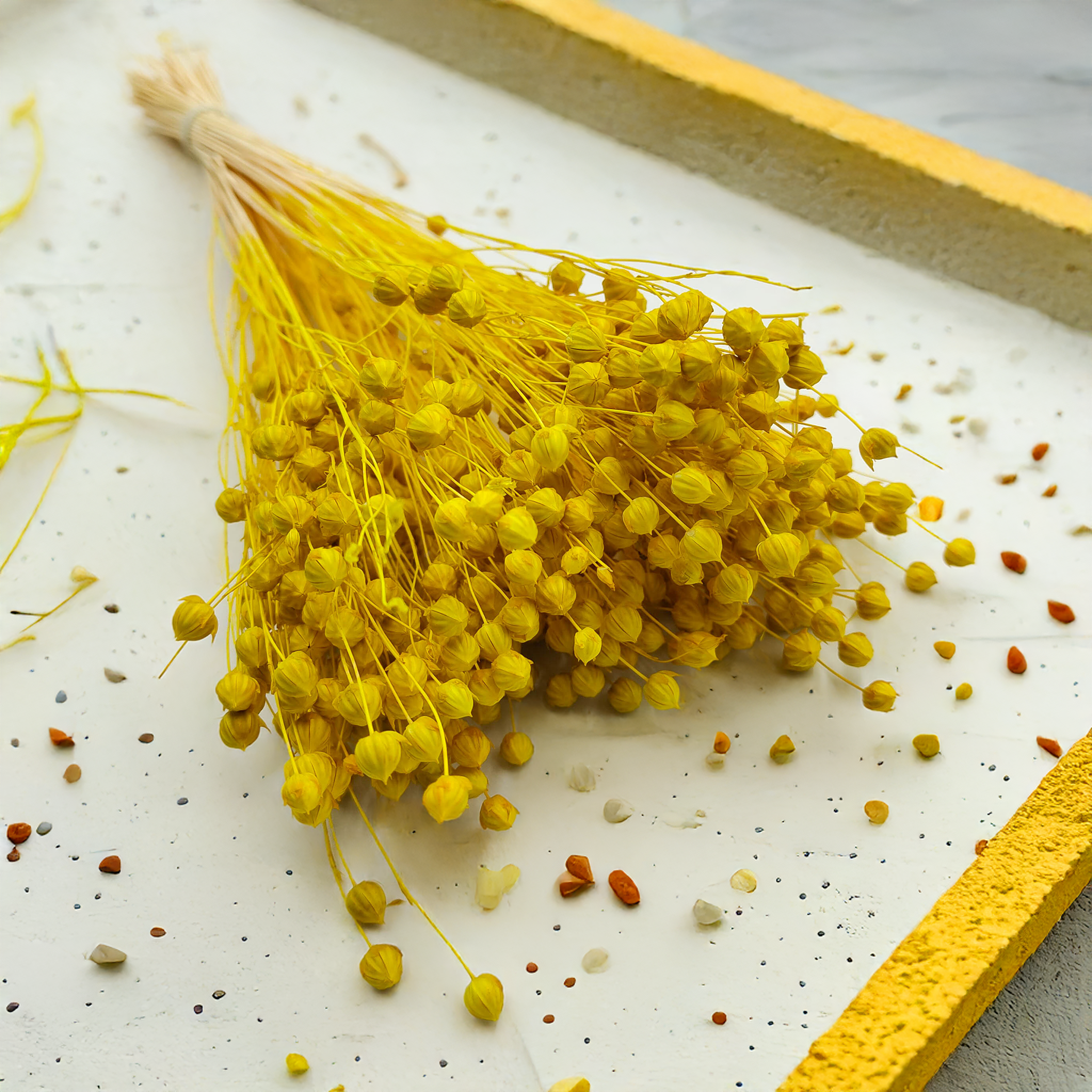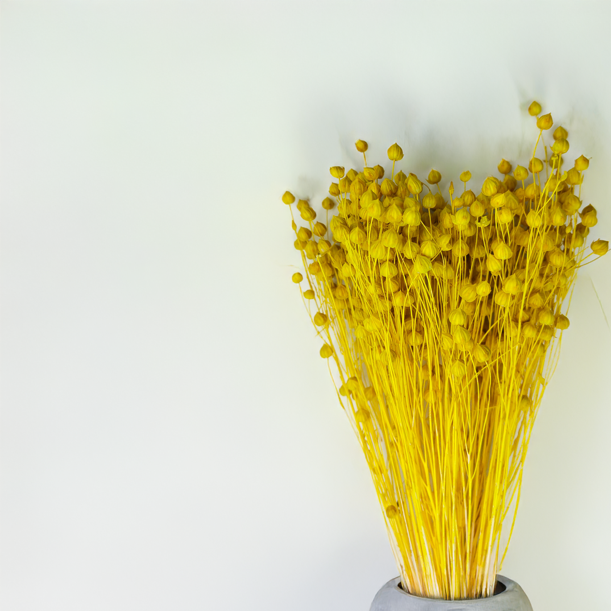 Le lin séché jaune apporte une touche lumineuse et joyeuse à toutes vos compositions. Jaune évoque la bonne humeur, l’énergie et la chaleur – idéal pour les décorations champêtres, bohèmes et rustiques.