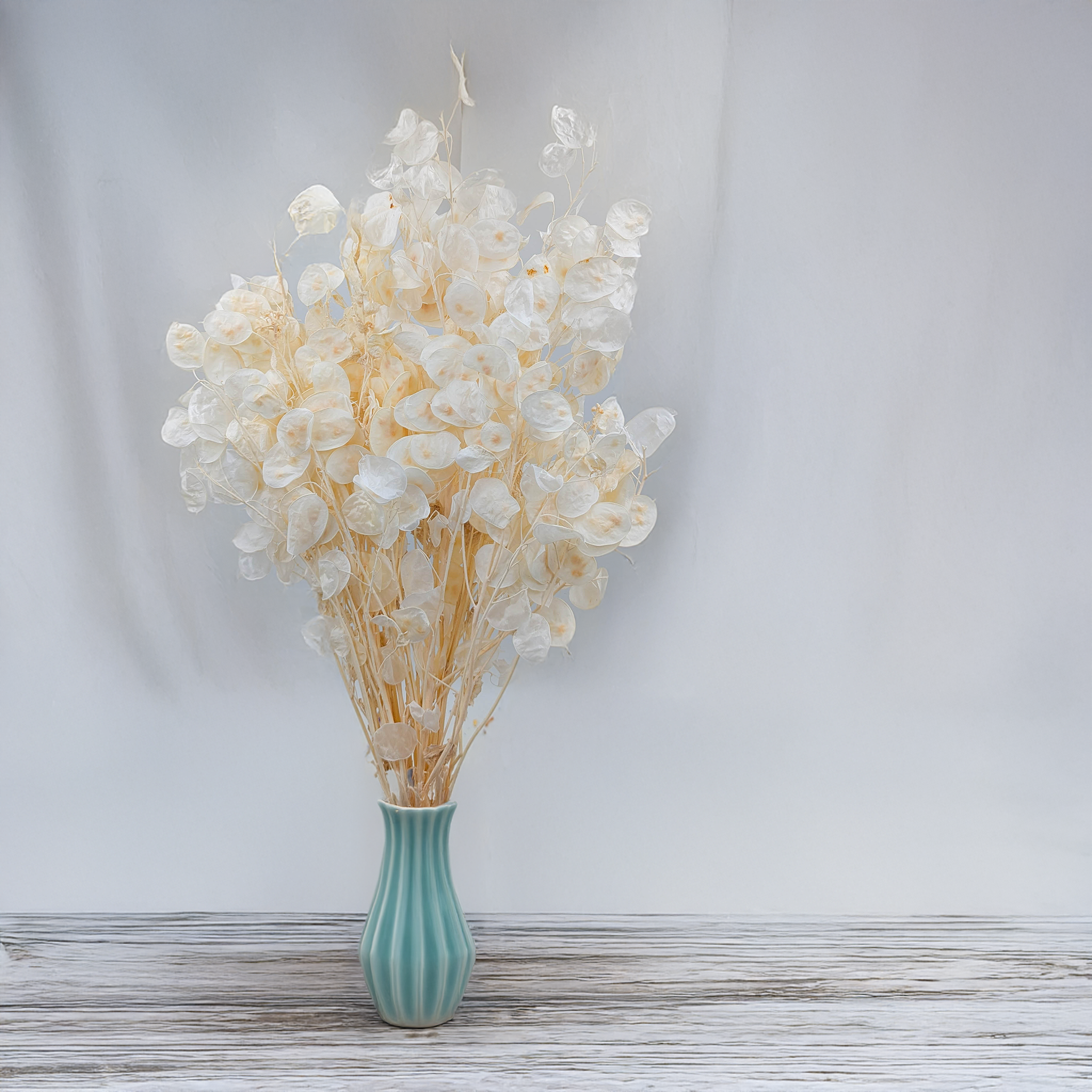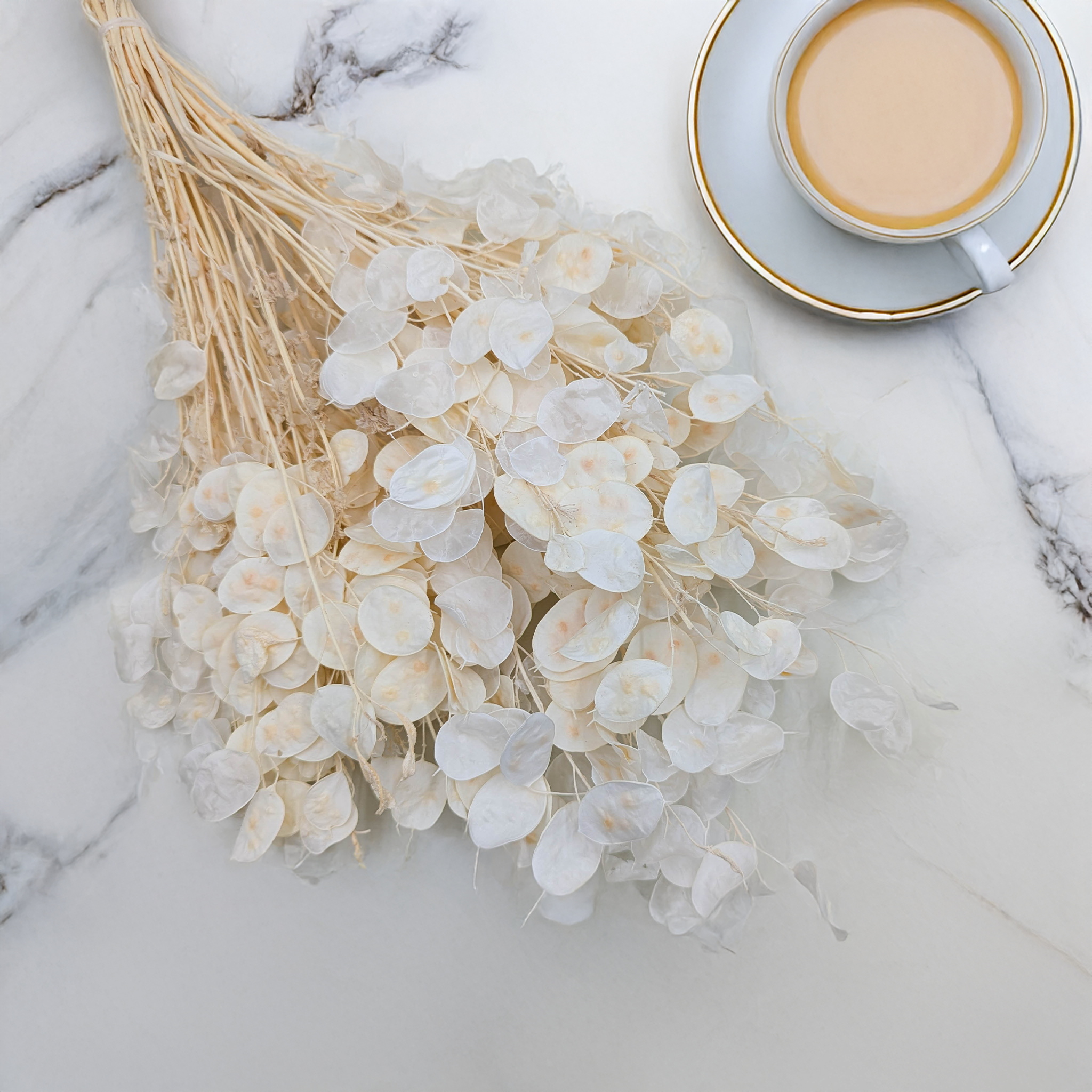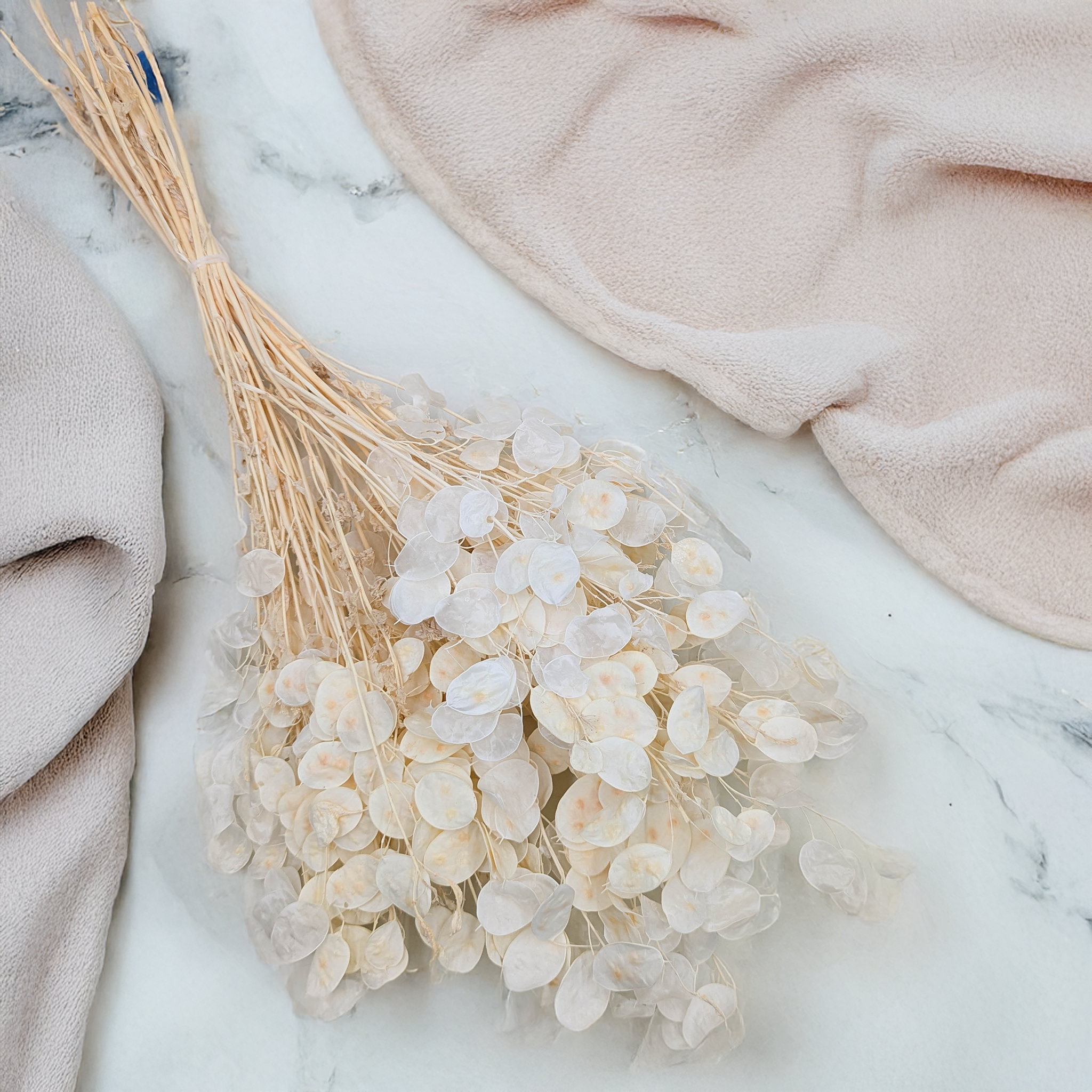 La lunaria blanchie, également appelée monnaie du pape, est une fleur séchée délicate aux reflets nacrés. Ses disques translucides et lumineux sont parfaits pour sublimer les compositions florales de mariage ou pour apporter une touche épurée à votre décoration intérieure.