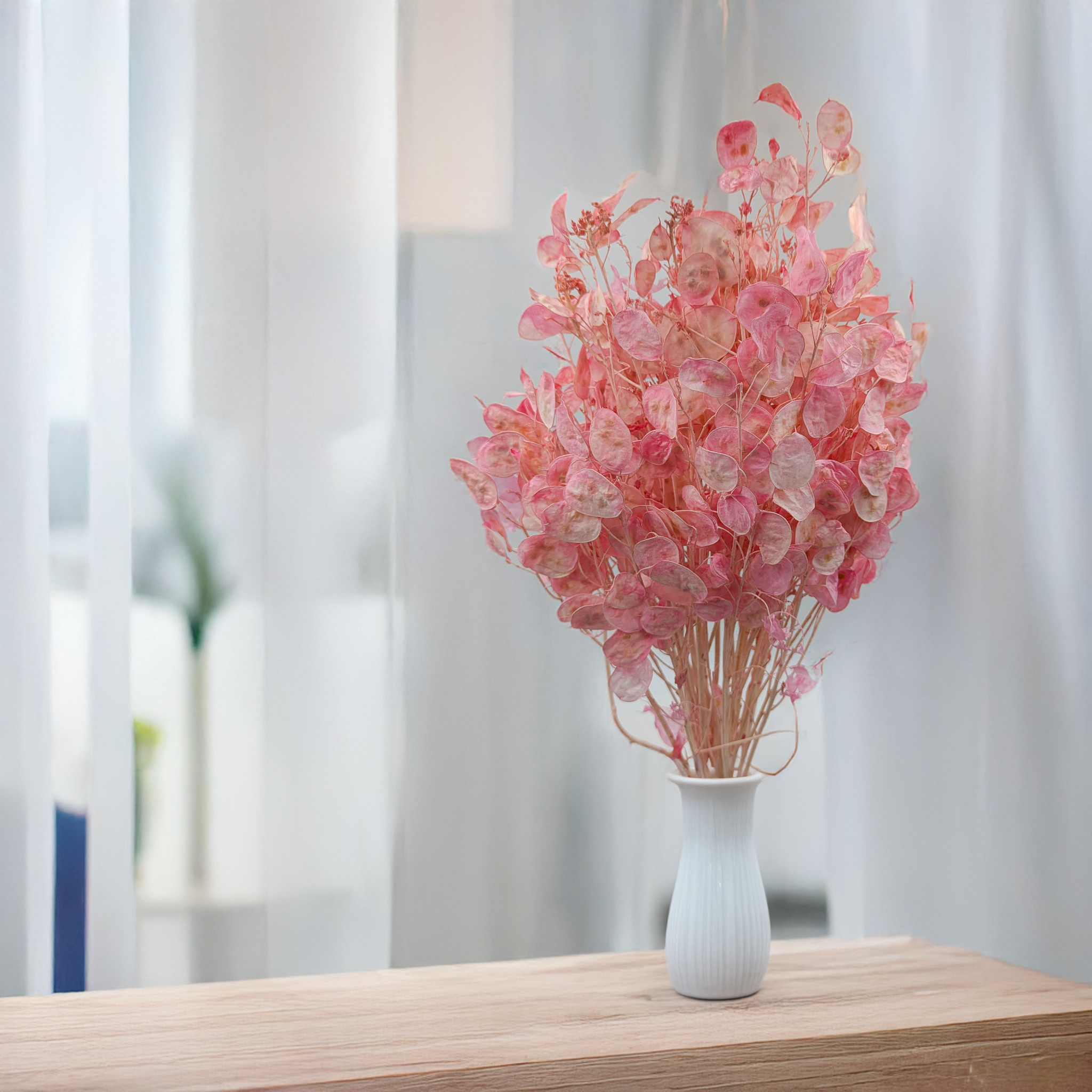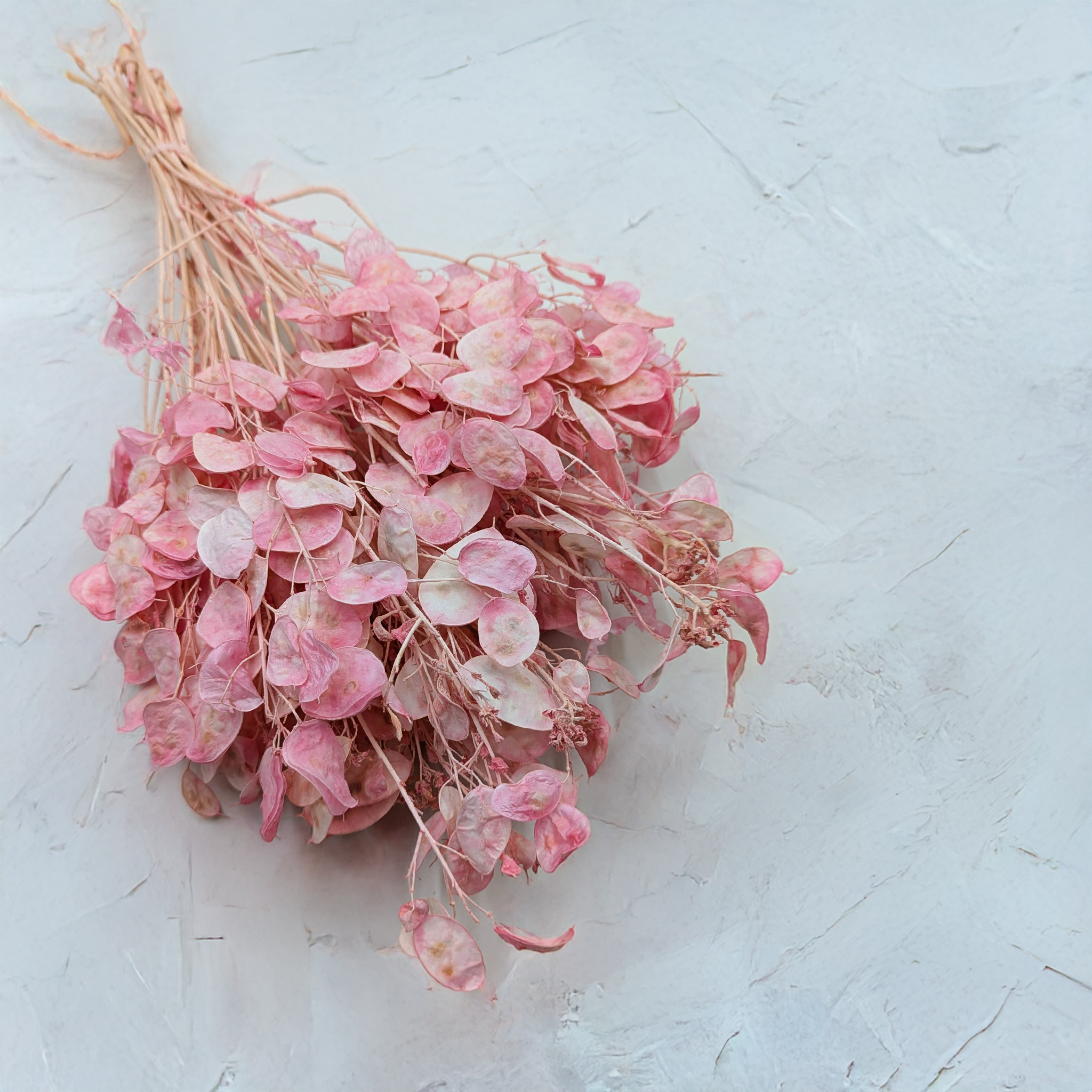 La lunaria séchée rose, appelée aussi monnaie du pape, séduit par sa texture fine et sa teinte rose poudré. C’est une fleur décorative idéale pour créer des ambiances douces, féminines et romantiques – en toute simplicité naturelle.