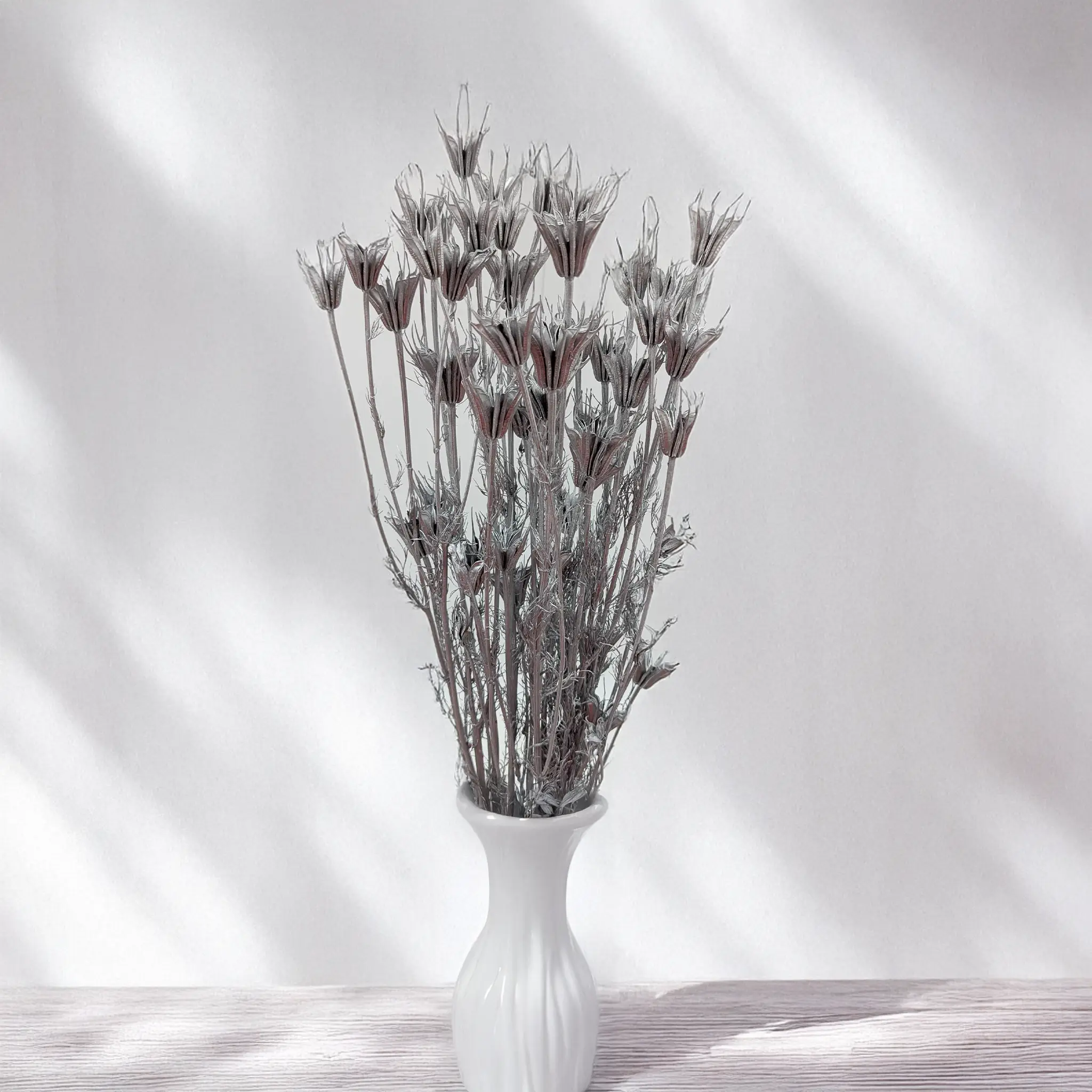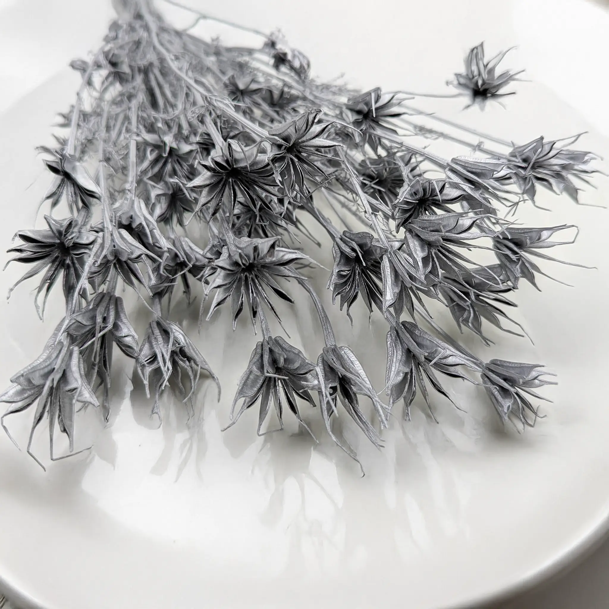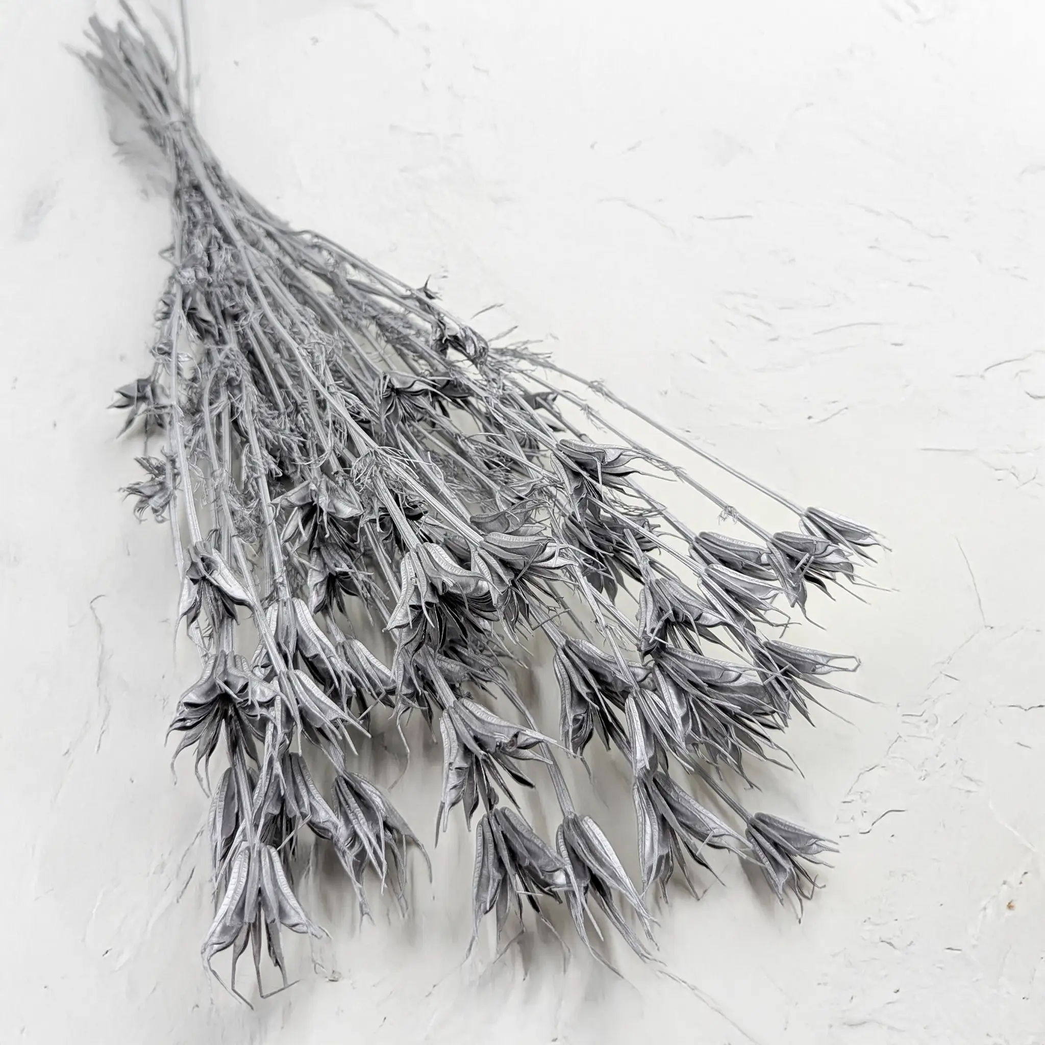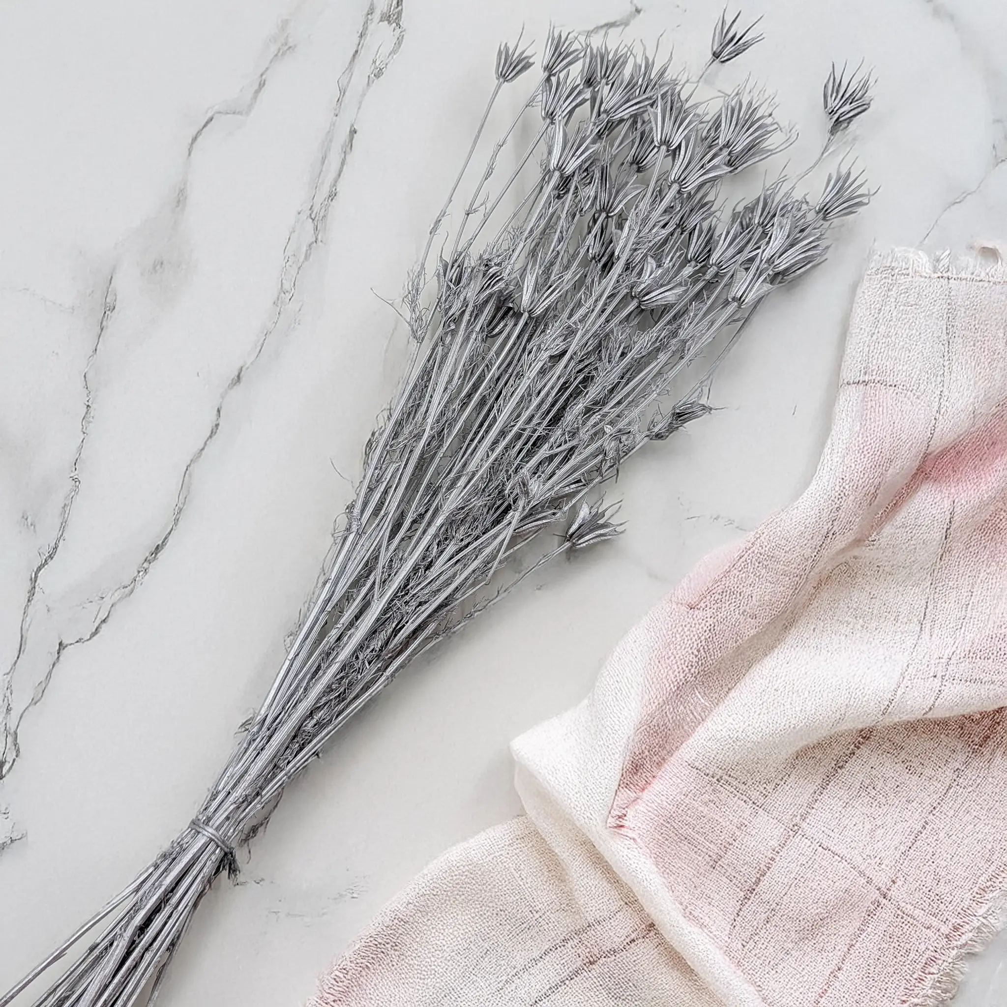 La nigelle orientale argentée (Nigella Orientalis) est une fleur séchée teintée d’une élégante brillance métallique. Ses fleurs étoilées fines et légères apportent volume, relief et raffinement aux compositions florales. Sa teinte argentée confère un aspect chic, moderne et festif.