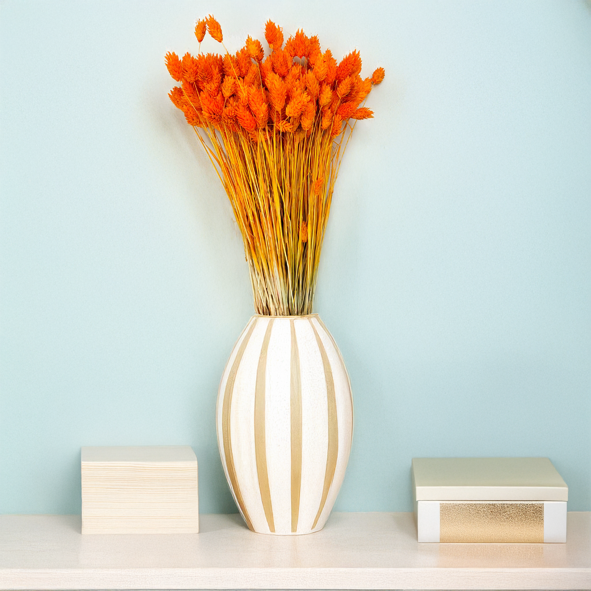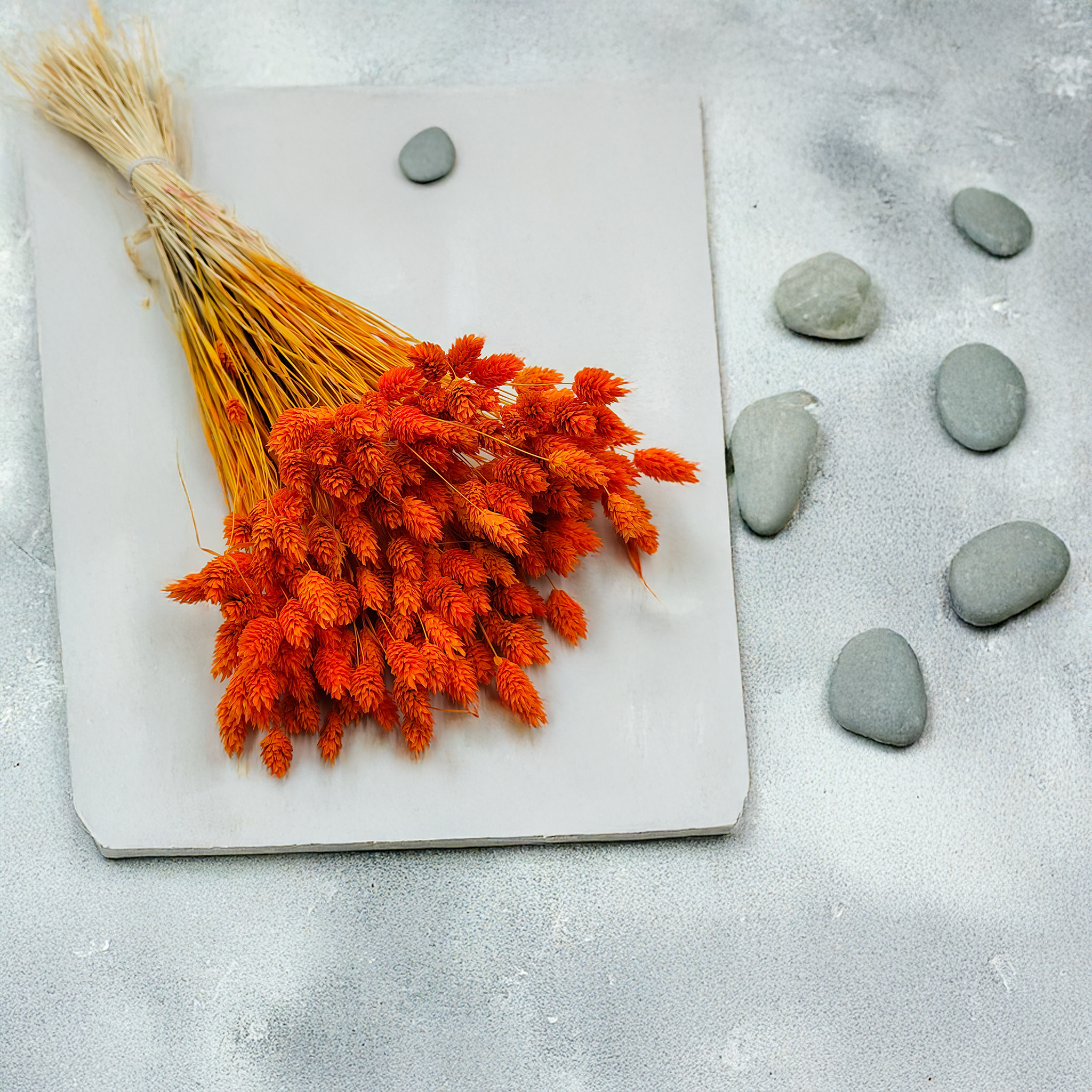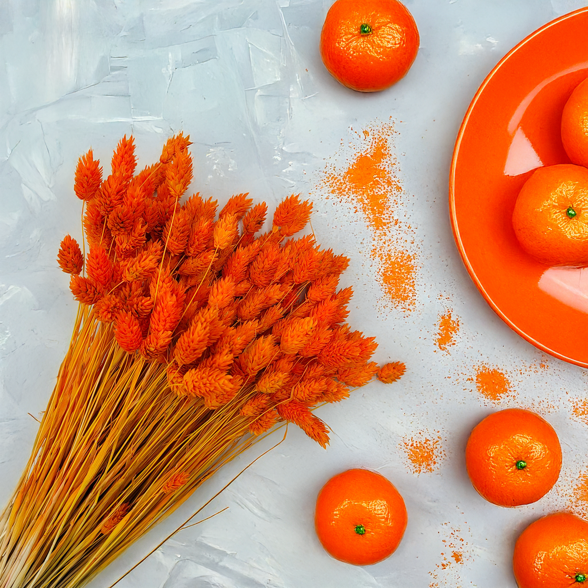 Phalaris Mandarynkowy to efektownie barwiona wersja mozgi kanaryjskiej (Phalaris Canariensis) – trawy ozdobnej pochodzącej z rejonów śródziemnomorskich i Wysp Kanaryjskich. Roślina ta jest znana z gęstych, kłosowatych kwiatostanów, które po wysuszeniu zachowują trwałość i strukturę przez wiele miesięcy. W tym wydaniu przyciąga wzrok wyjątkowo ciepłym i nasyconym odcieniem mandarynkowym.
