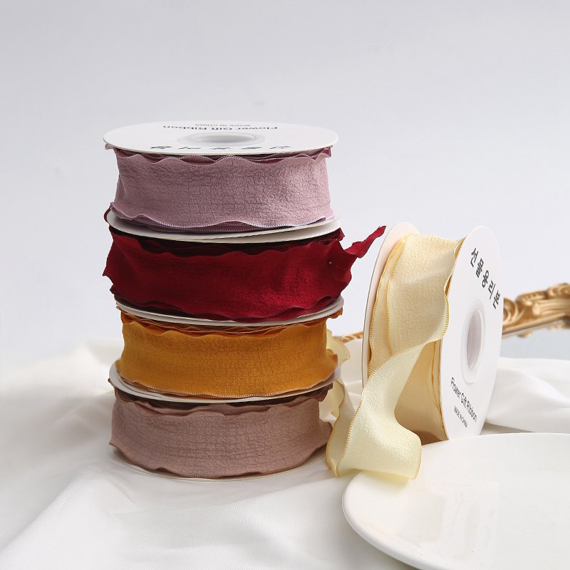 Le ruban floristique blanc cassé, légèrement ondulé avec des bords joliment cousus, est un produit exceptionnel, idéal pour créer des compositions florales élégantes, y compris des bouquets de mariage.