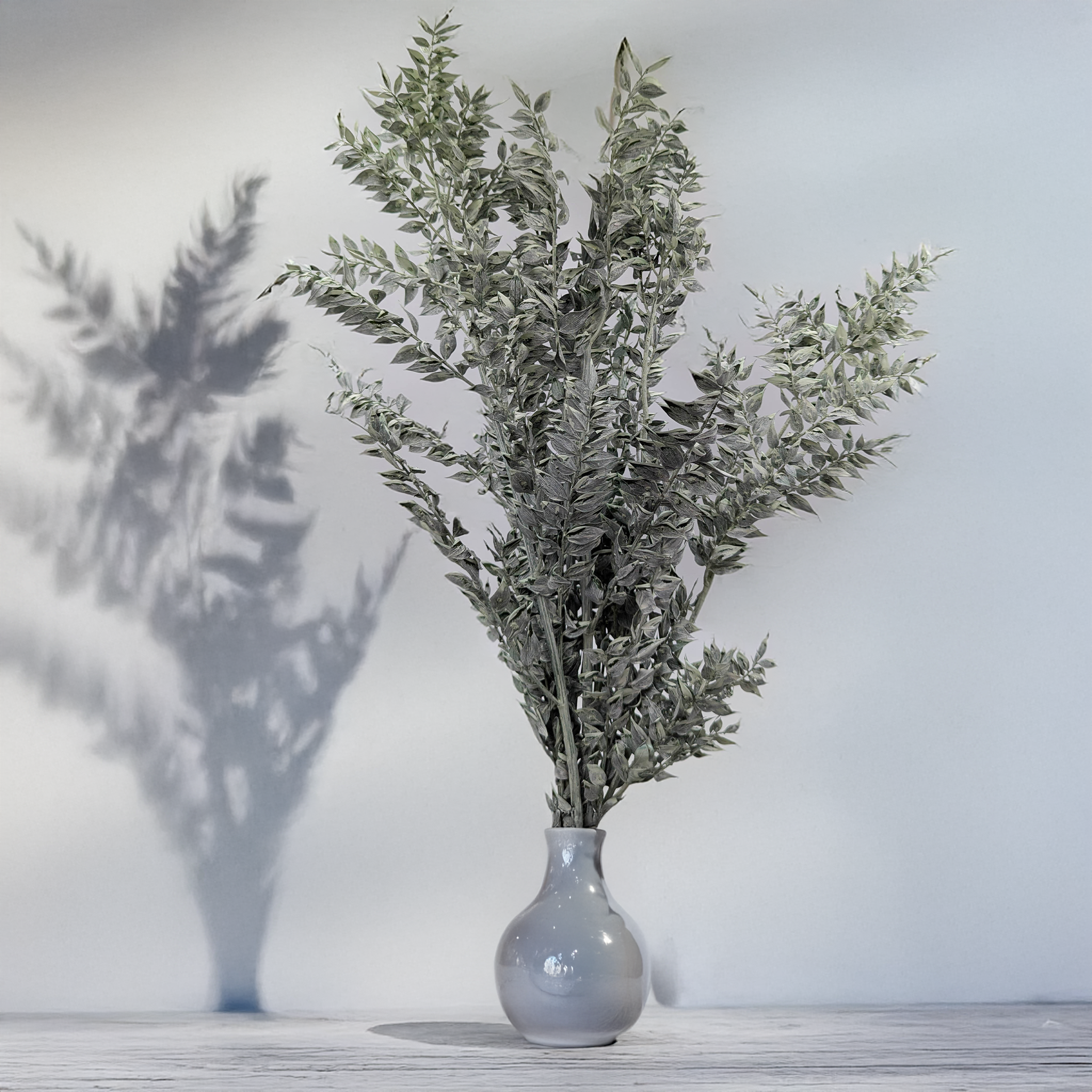 Le vert symbolise la vie, la sérénité et l’équilibre. Sa finition mate permet au ruscus de s’harmoniser avec des tons neutres comme le beige, l’écru et le blanc, mais aussi avec des pastels, le bordeaux, le violet ou le jaune moutarde. Il peut jouer le rôle d’arrière-plan ou devenir l’élément central d’une composition.