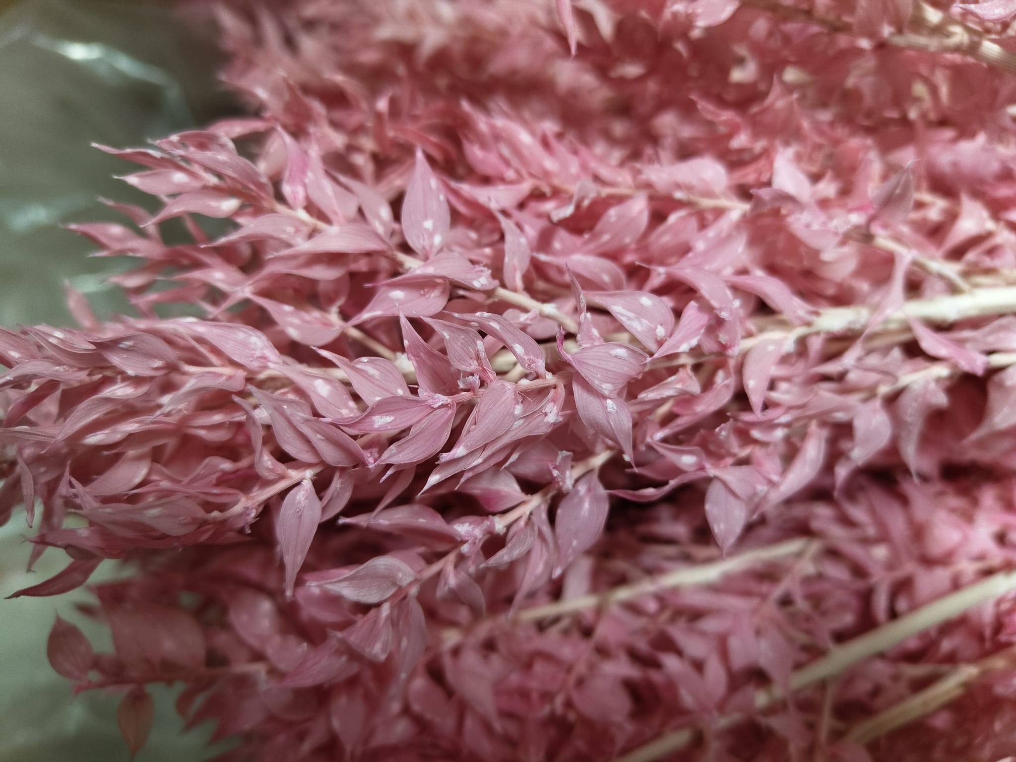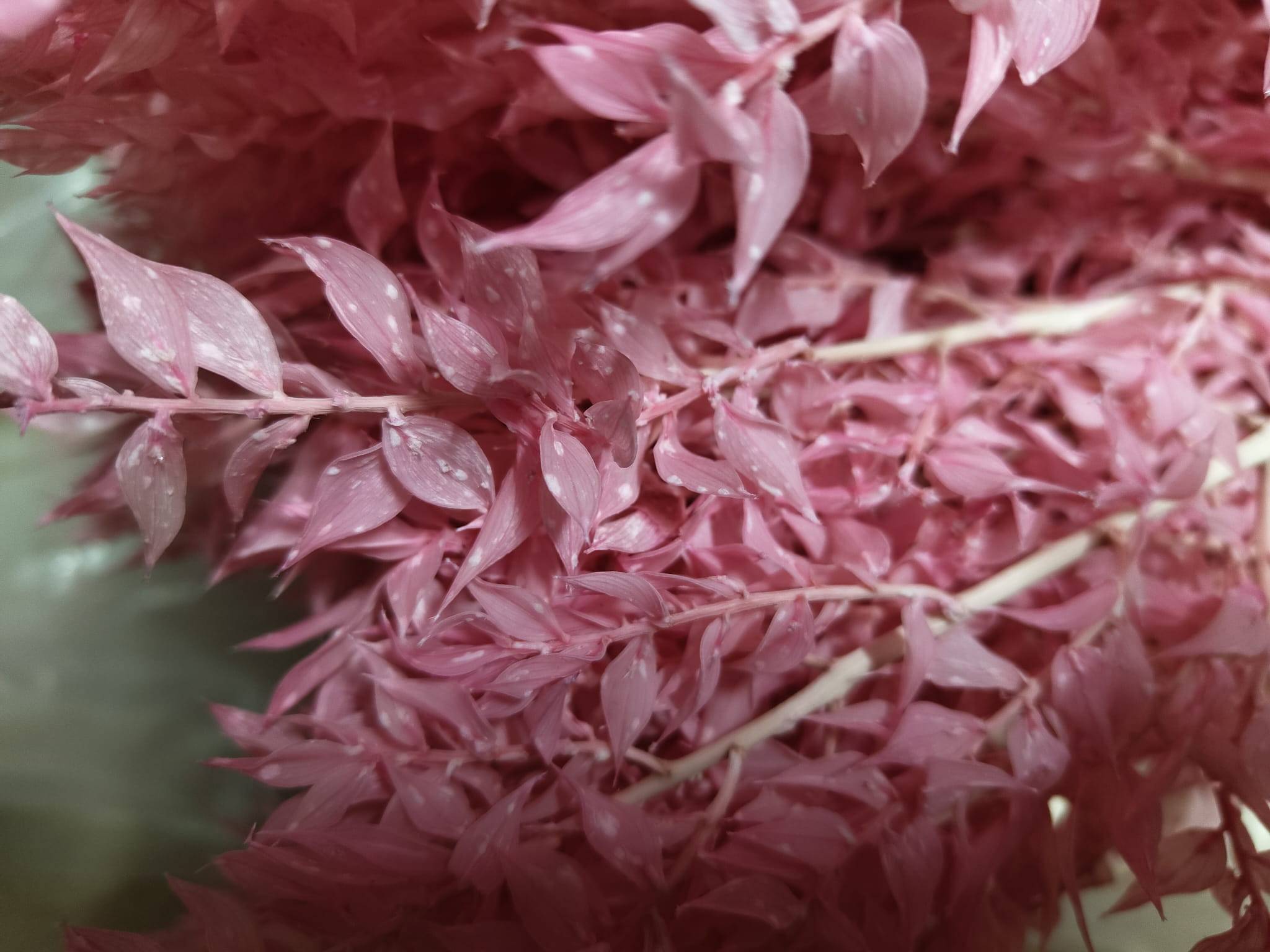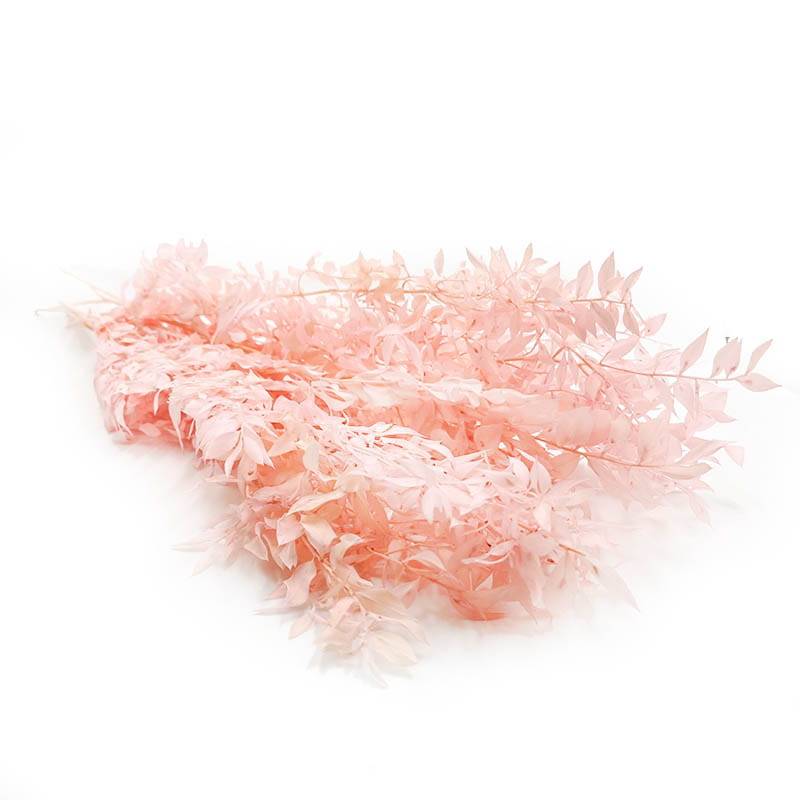 Ruscus Stabilisé - Rose Pastel - Des traces de blanchiment sont visibles sur les feuilles par endroits